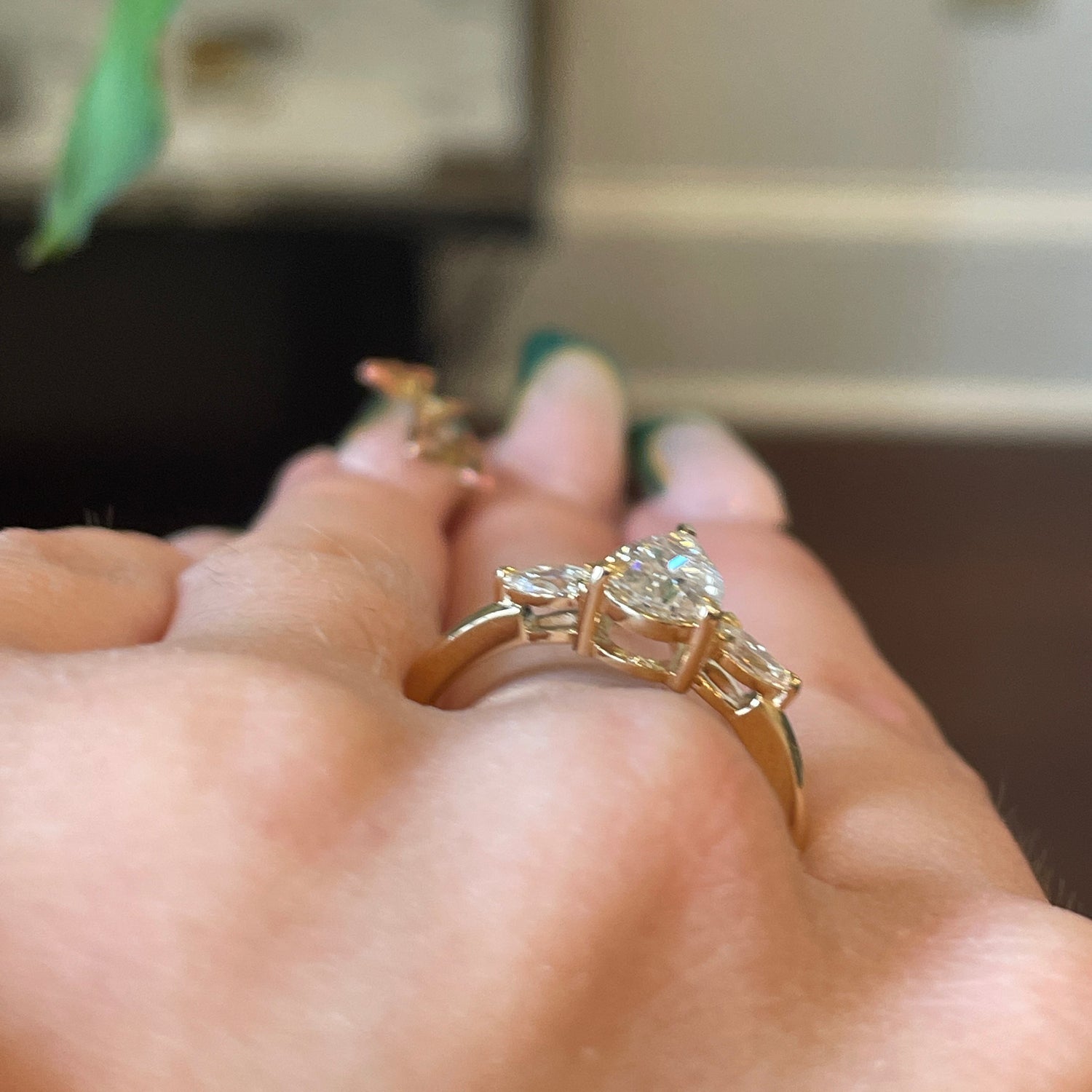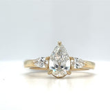 1.33 Ctw LAB pear cut Diamond 3 stone ring in 14kt yellow gold ring setting. 1 Ct center LAB pear diamond & 0.33 Ctw LAB Diamond accents. Diamonds are E in color, VS1 in clarity. This ring is a size 7 but can be resized if needed, just drop us a note at checkout for a quote!