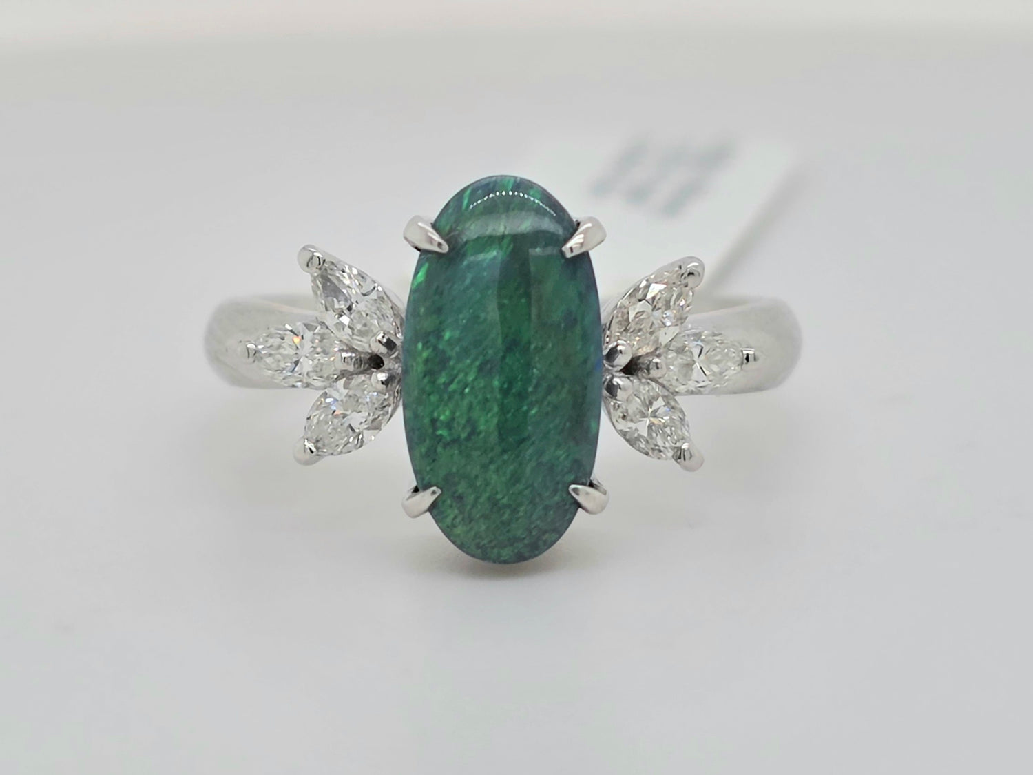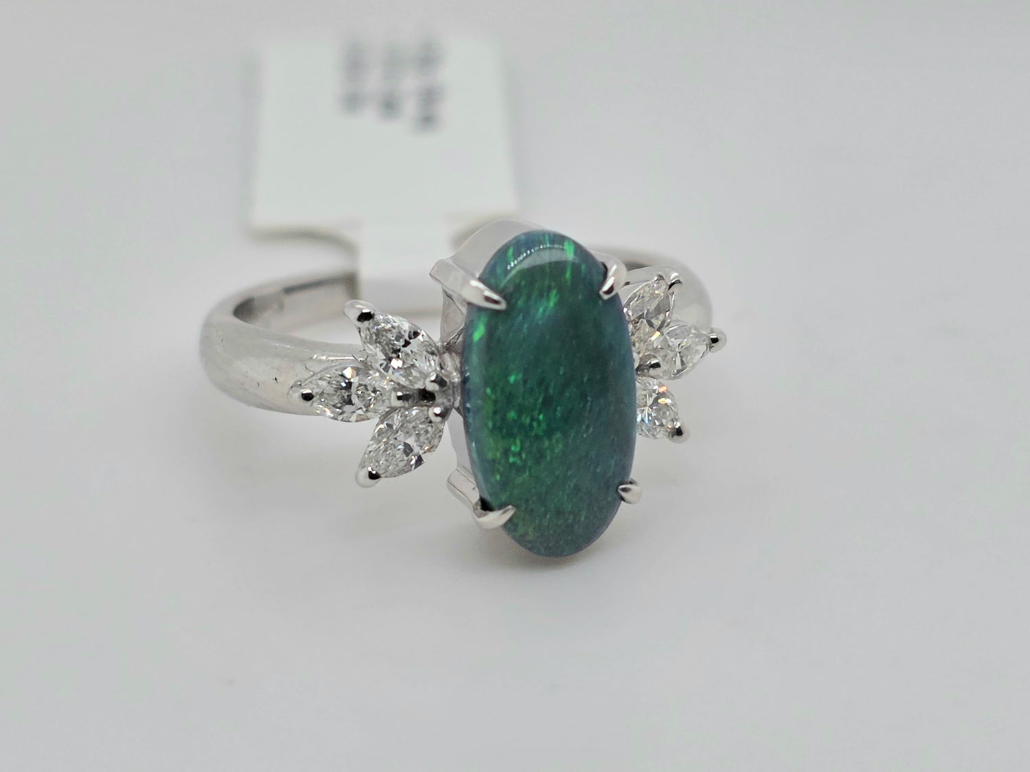 1.57ct oval black opal & .43ctw natural diamond ring in 18kt white gold. this ring is a size 6.5 and can be sized just let us know what size is needed.