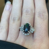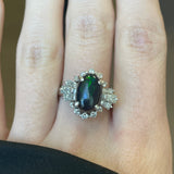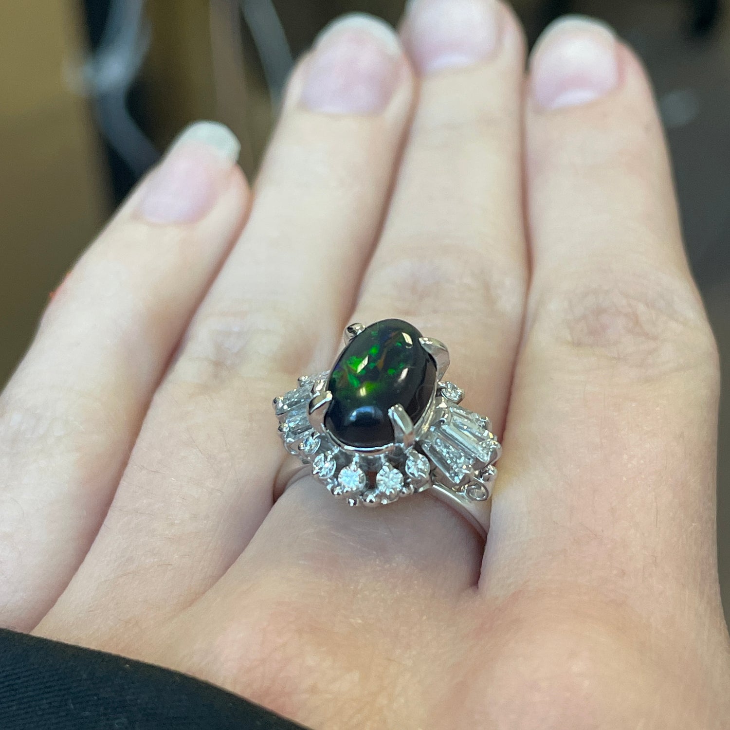 2.05 Ct Black Opal & 0.80 Ctw natural Diamond ring set in Platinum ring setting. This ring is a size 6 1/4 but can be resized if needed, just drop us a note at checkout for a quote!