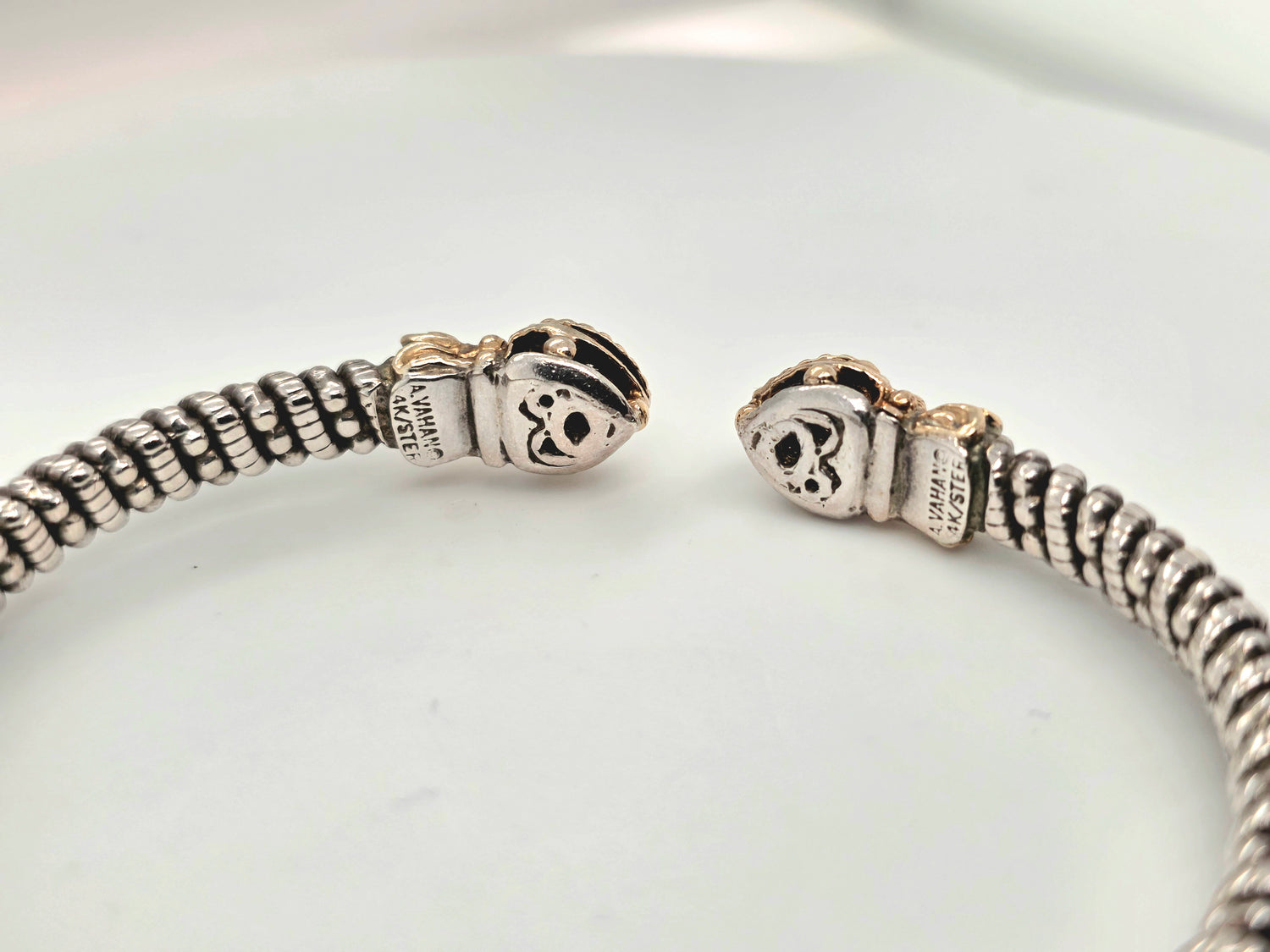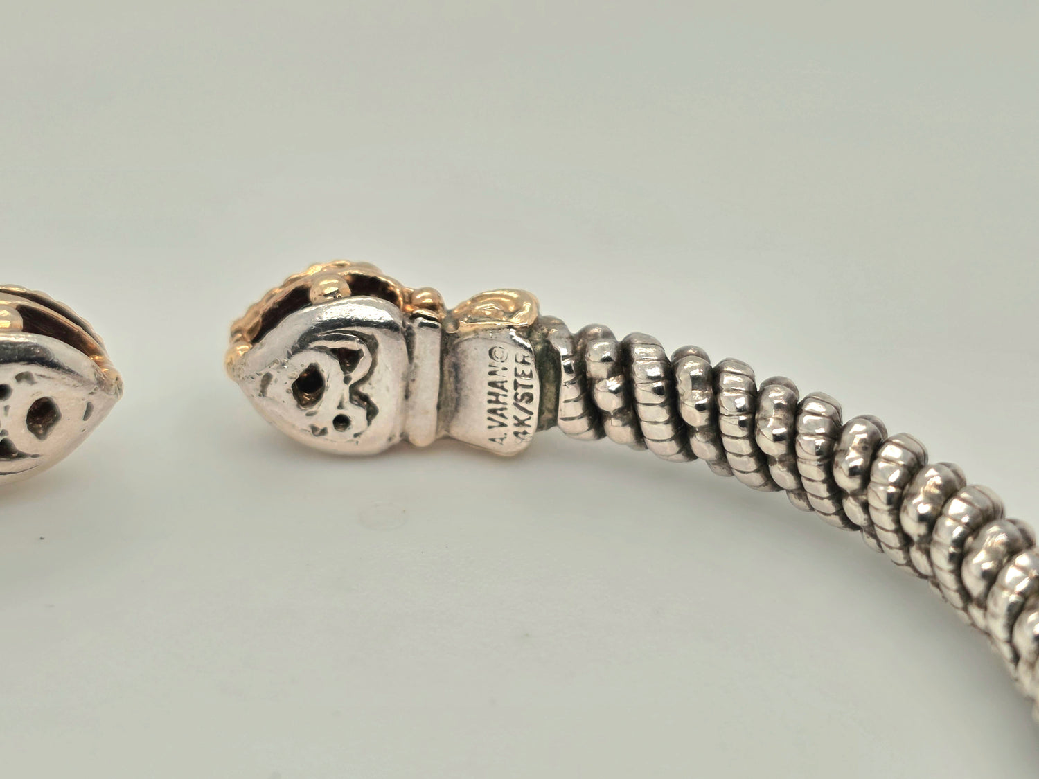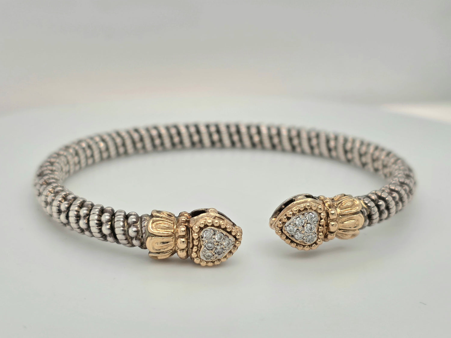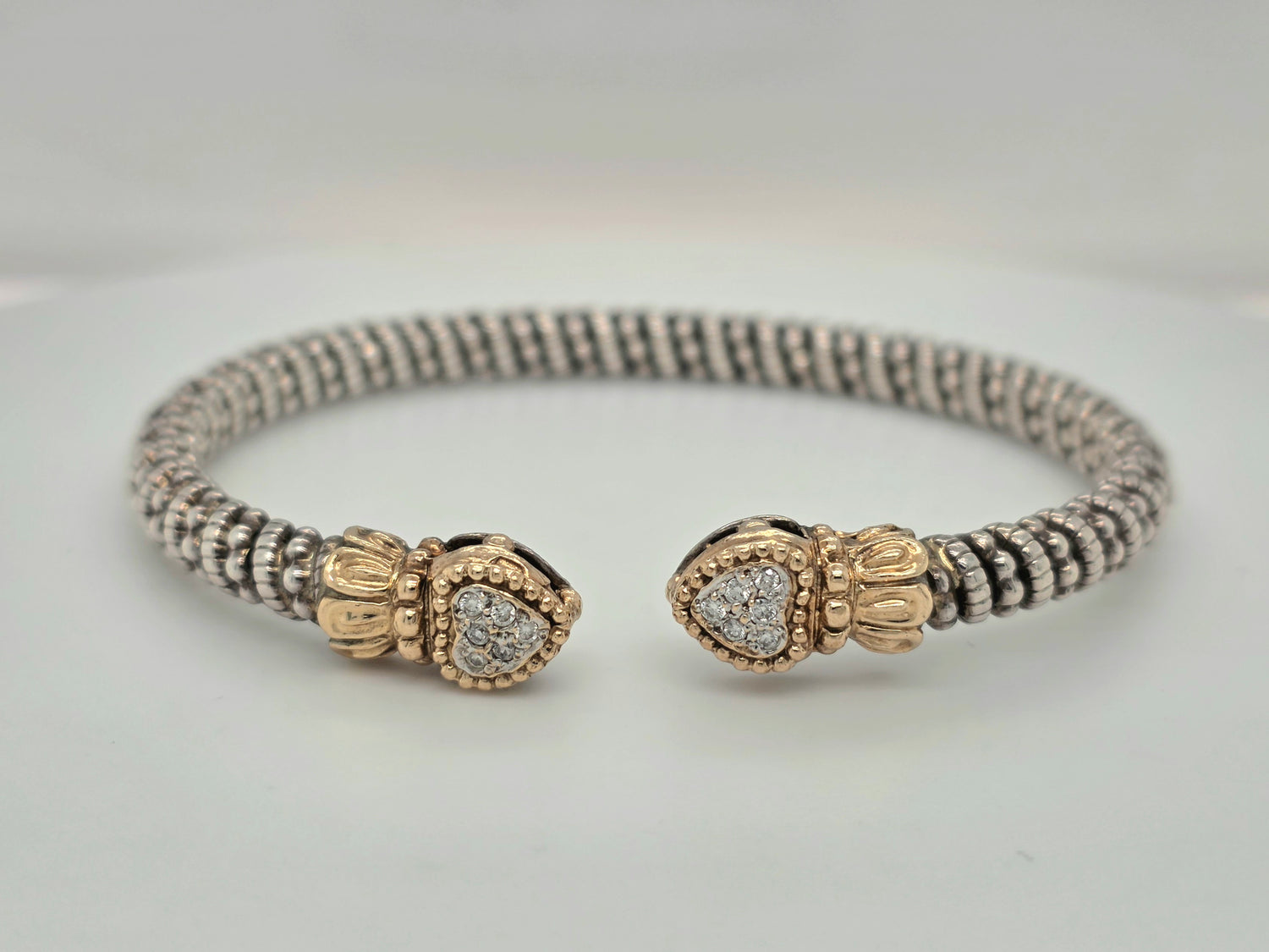 Vahan 14kt gold & sterling silver diamond cuff bracelet heart shaped ends 5mm wide
