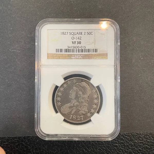 This 1827 U.S. 50-cent coin (Capped Bust, Small 2) is composed of 90% silver and graded VF30 by NGC.
