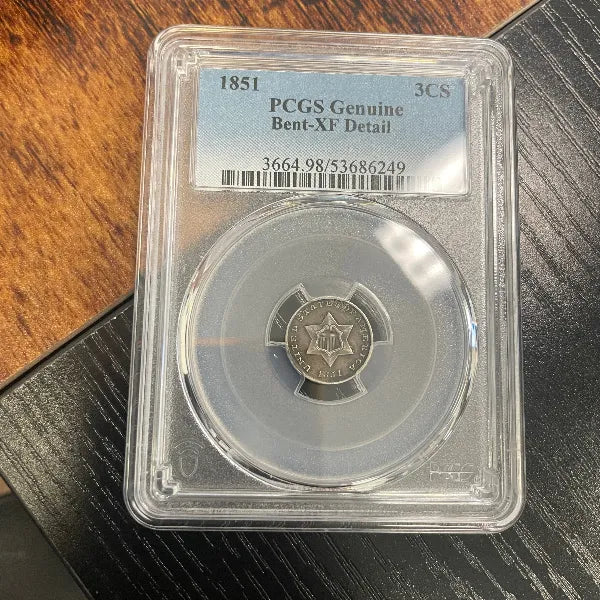 This 1851 U.S. Three-Cent Silver coin is graded XF (Extremely Fine) Detail by PCGS and is noted as genuine but bent.