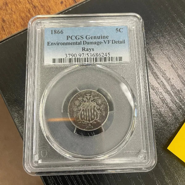 This 1866 U.S. Half Dime is graded VF (Very Fine) Detail by PCGS and is noted as genuine with environmental damage.