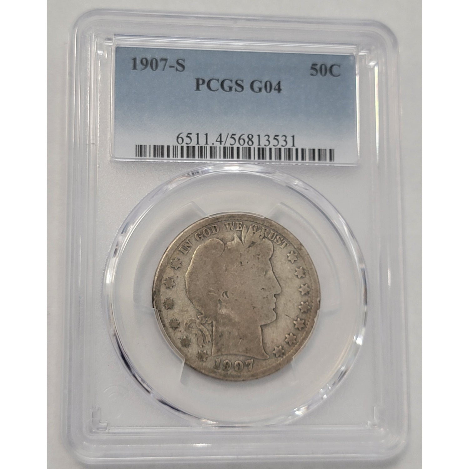 Collectible 1907-S Barber Half Dollar, graded G04 by PCGS, featuring San Francisco mint provenance.