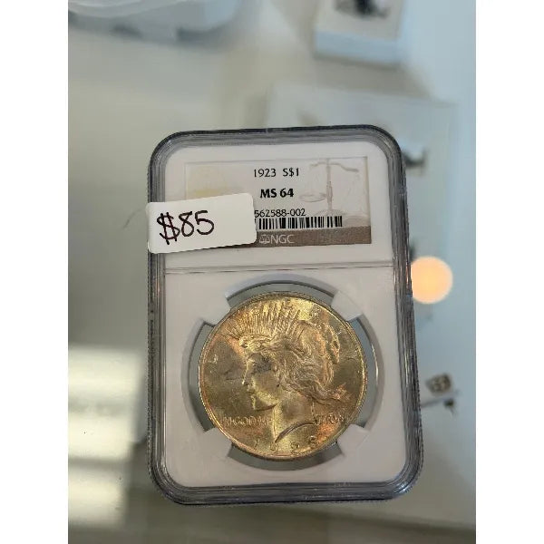 This 1923 Peace Silver Dollar is graded MS64 by NGC, indicating a Mint State coin with minimal contact marks.