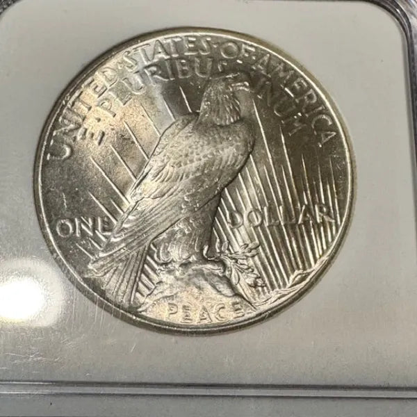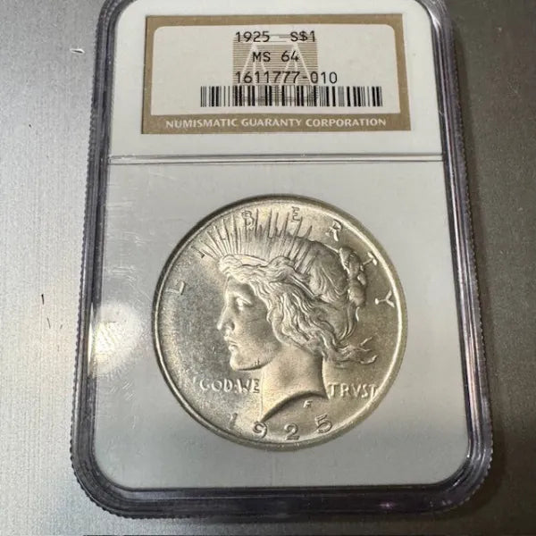 This 1925 Philadelphia Mint Peace Dollar is composed of 90% silver and 10% copper and is graded MS64 by NGC, indicating a Mint State coin with strong luster and minimal marks.