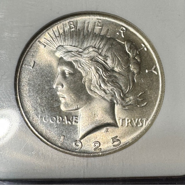 This Nice Philadelphia mint 1925 Peace dollar is 90% Silver & 10% copperr. Minted in 1925 this coin is graded Mint State 64 by NGC