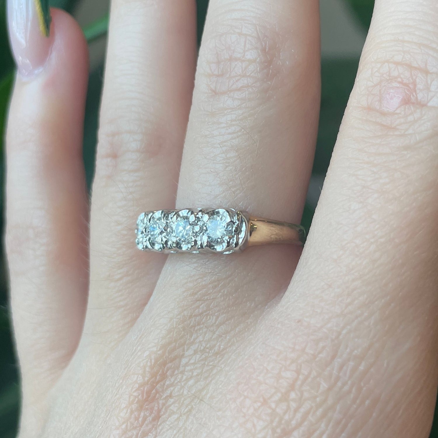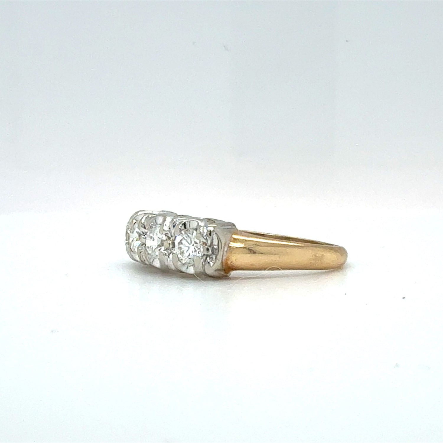0.60 Ctw natural Diamond 4 stone ring all set in 14kt two-toned gold. 3.3g total weight. This ring is a size 6 but can be resized if needed, just drop us a note at checkout for a quote!
