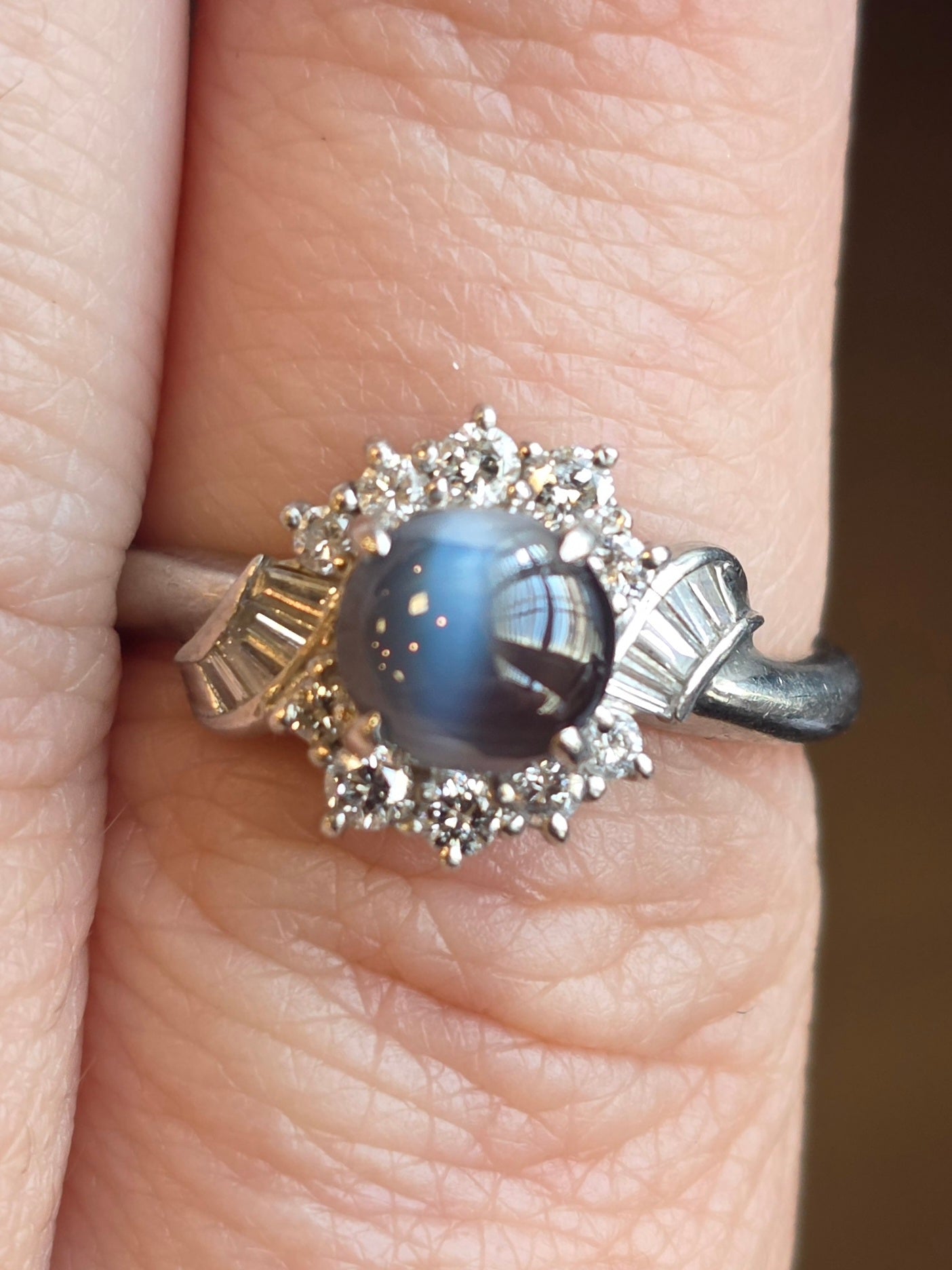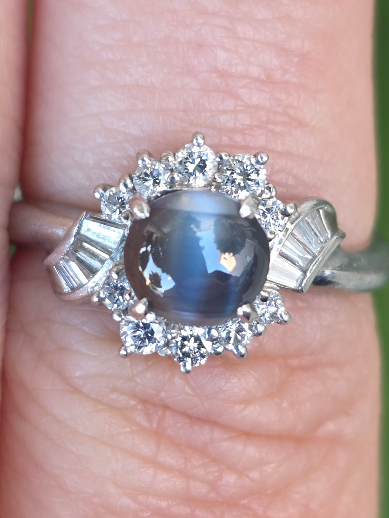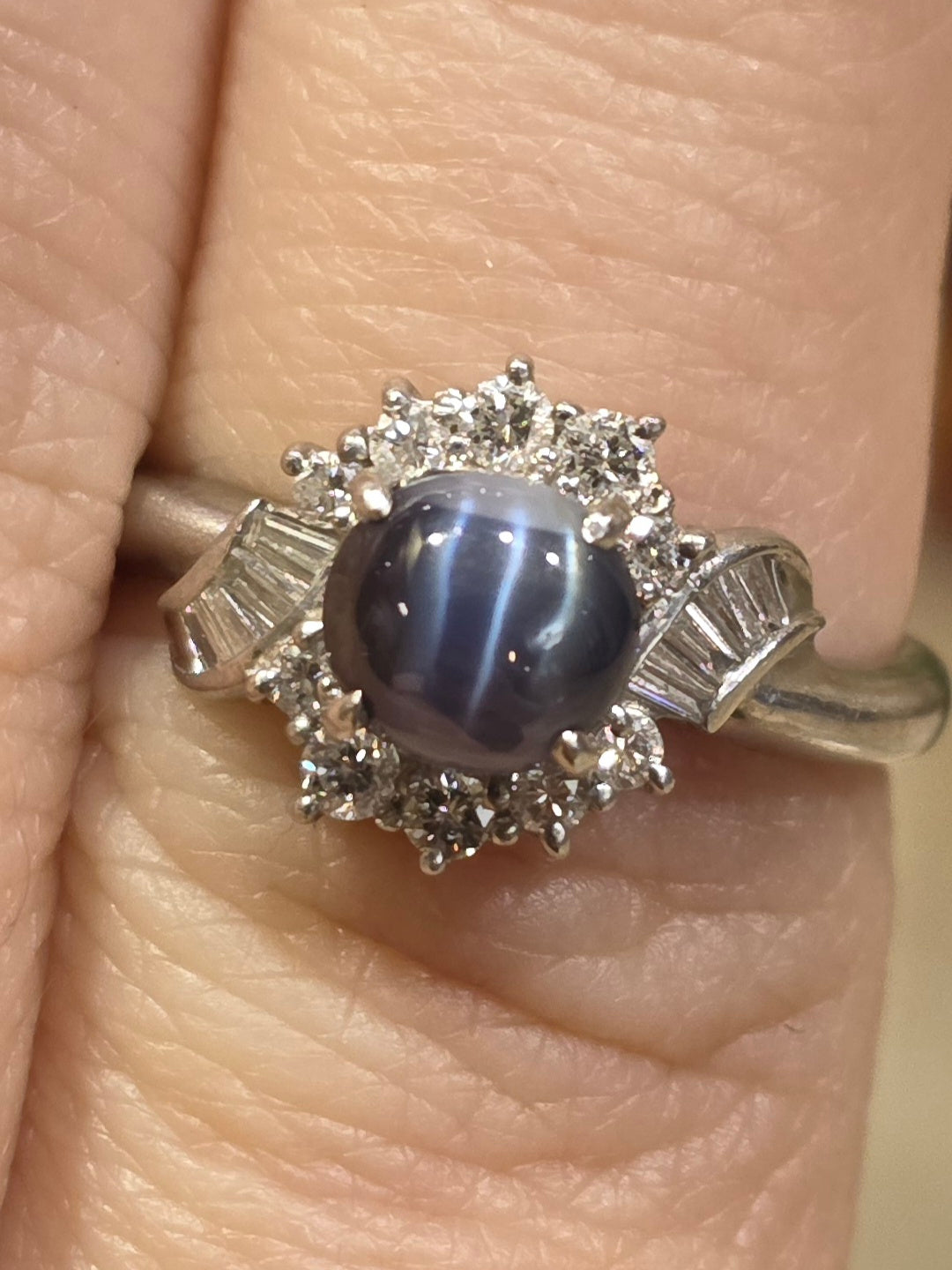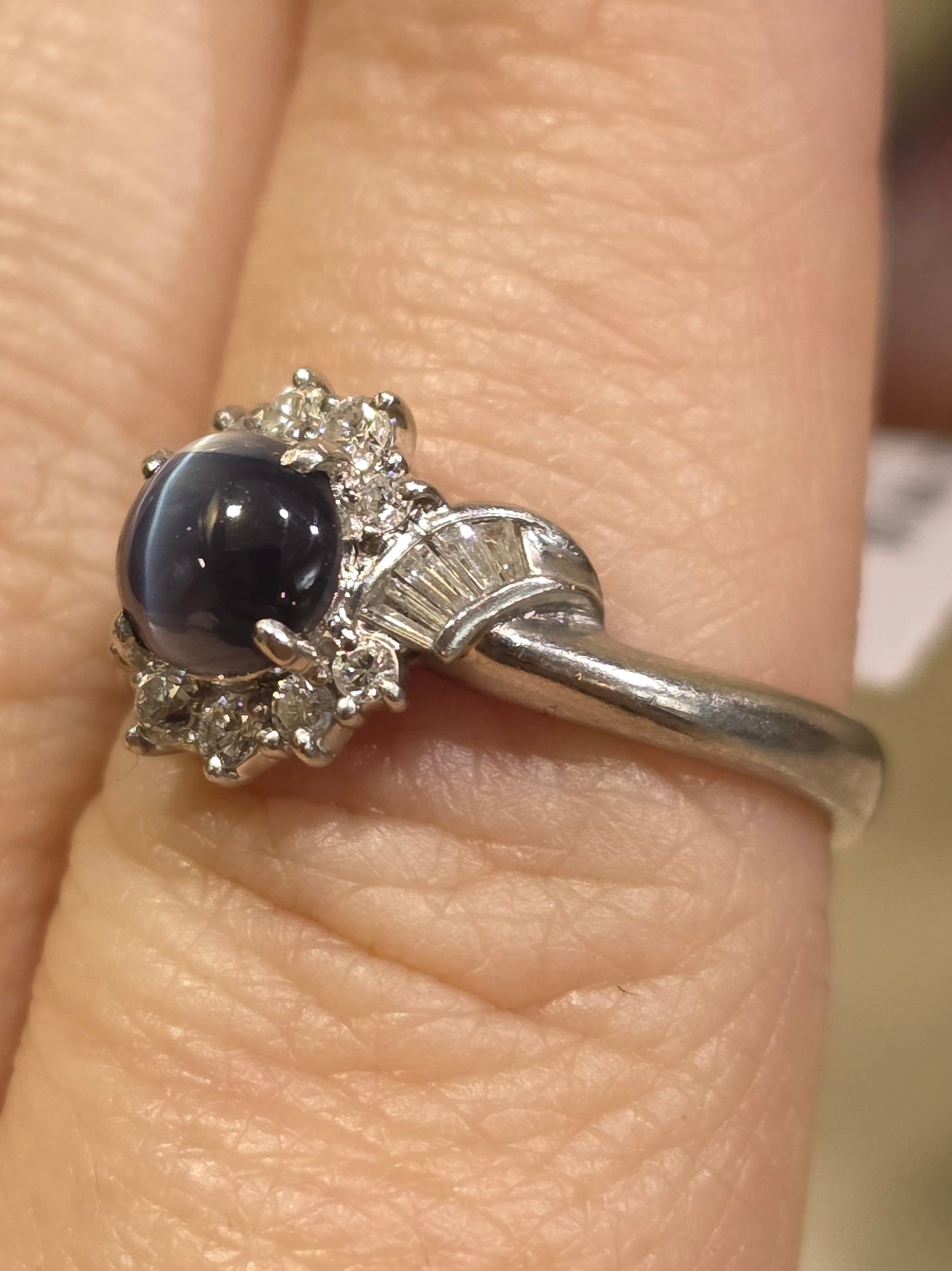 1.05 Ct cats eye Alexandrite & 0.33 Ctw natural Diamond ring set in Platinum ring setting. This ring is a size 6 1/4 but can be resized if needed, just drop us a note at checkout for a quote!