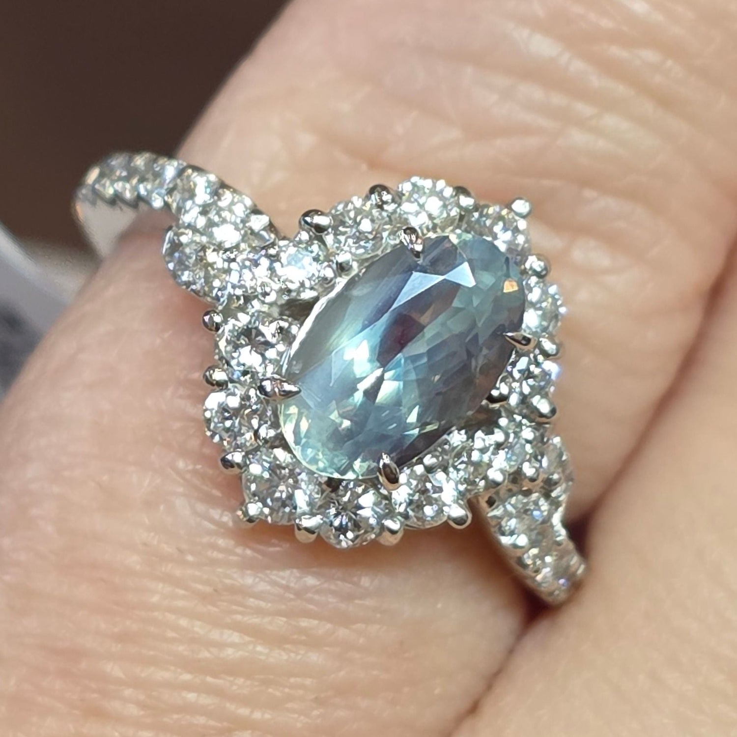Natural 1.58ct Alexandrite and .71ctw natural diamond ring. Ring has GIA report with India Origin and color change described as bluish green changing to Grayish Purple. Ring is a size 5.75 but can be sized if needed just let us know what size is needed.