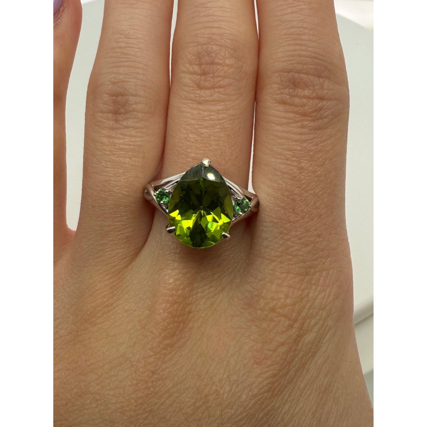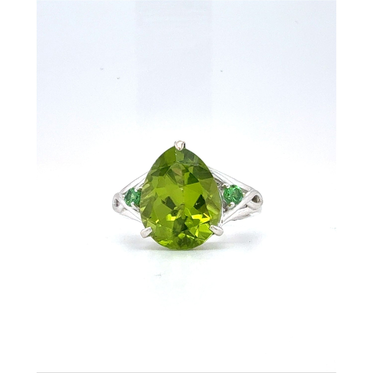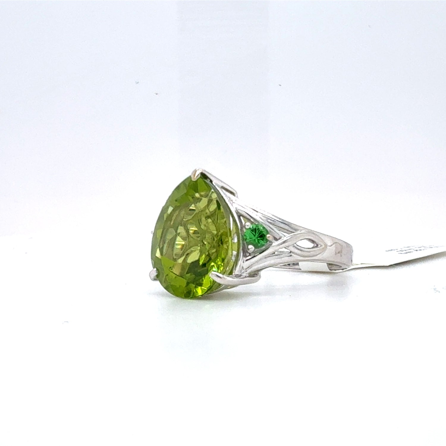 6.34 Ct Peridot & 0.14 Ctw Tsavorite Garnet accents set in 18Kt white gold ring. This ring is a size 6.5 but can be resized if needed, just drop us a note at checkout for a quote!