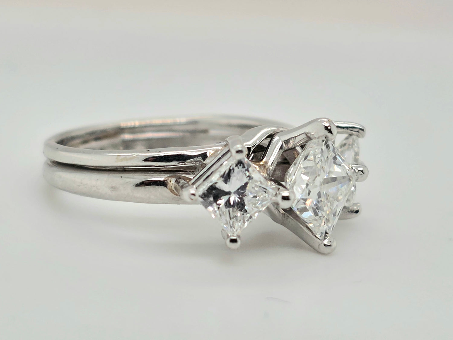 2.24ctw Natural 3 stone princess cut diamond ring Platinum & 14kt white gold ring. Center diamond is a 1.22ct princess cut si2 and G in color with two 1/2ct accent princess cut diamonds on each side.  Ring is a size 5.5 and can be sized just let us know the sized needed and we can quote a price on sizing.
