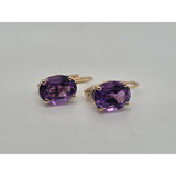 These 2ct amethyst earrings are set in 14kt yellow gold, offering a vibrant pop of color with the rich purple hue of the amethysts.