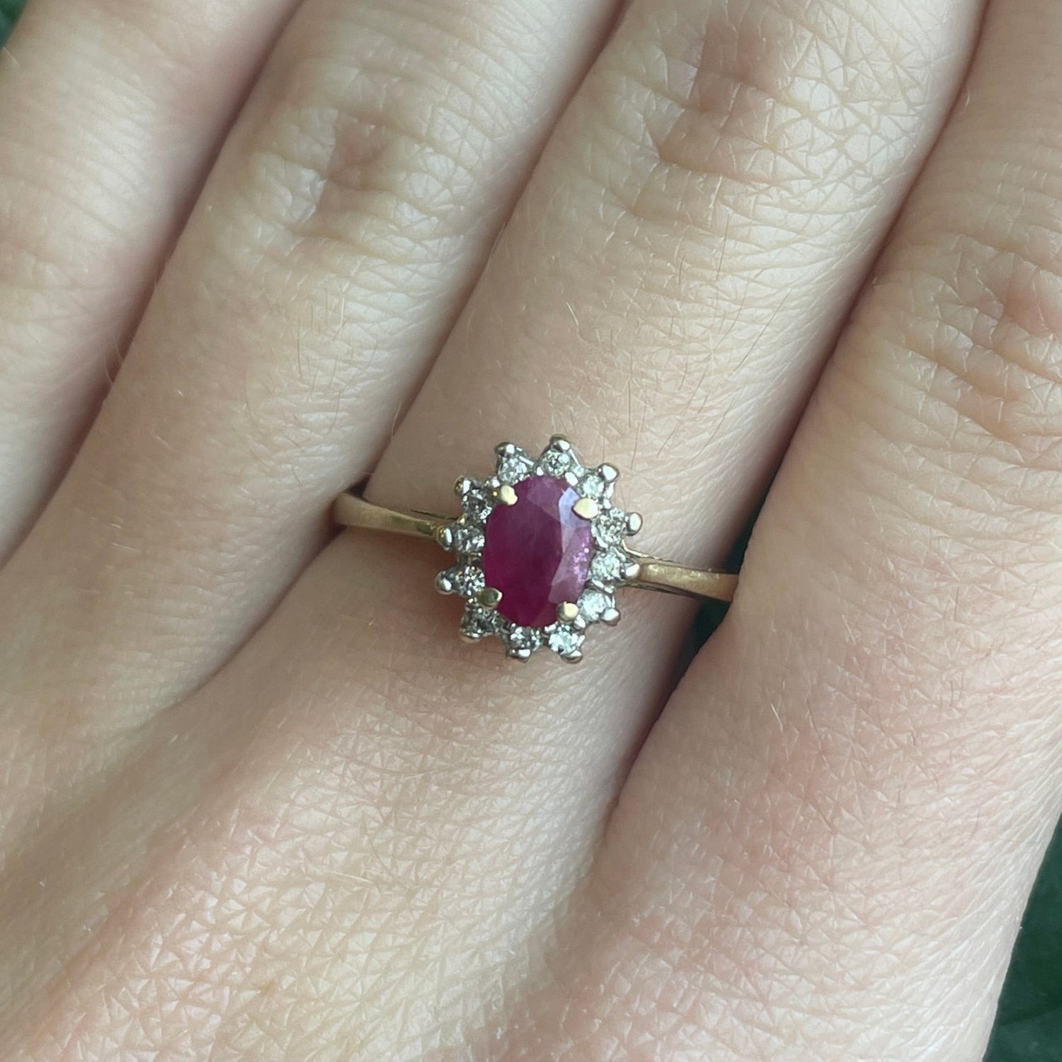 3/4 Ctw Ruby & 0.10 Ctw natural Diamond Ring in 10kt Yellow gold. This ring is a size 7 3/4 and can be resized if needed, just drop us a note at checkout for a quote!