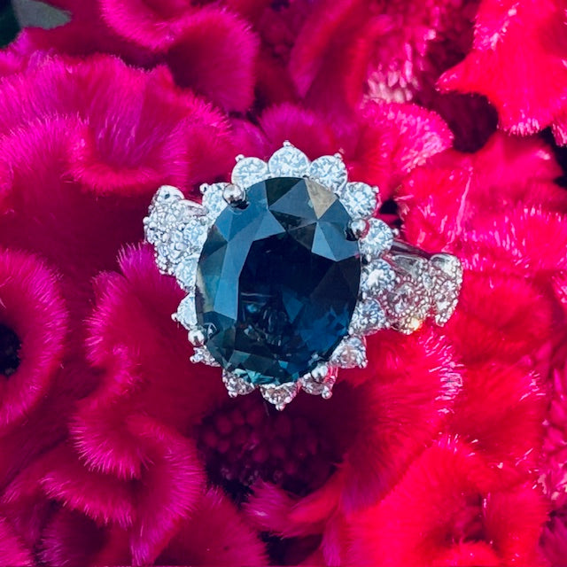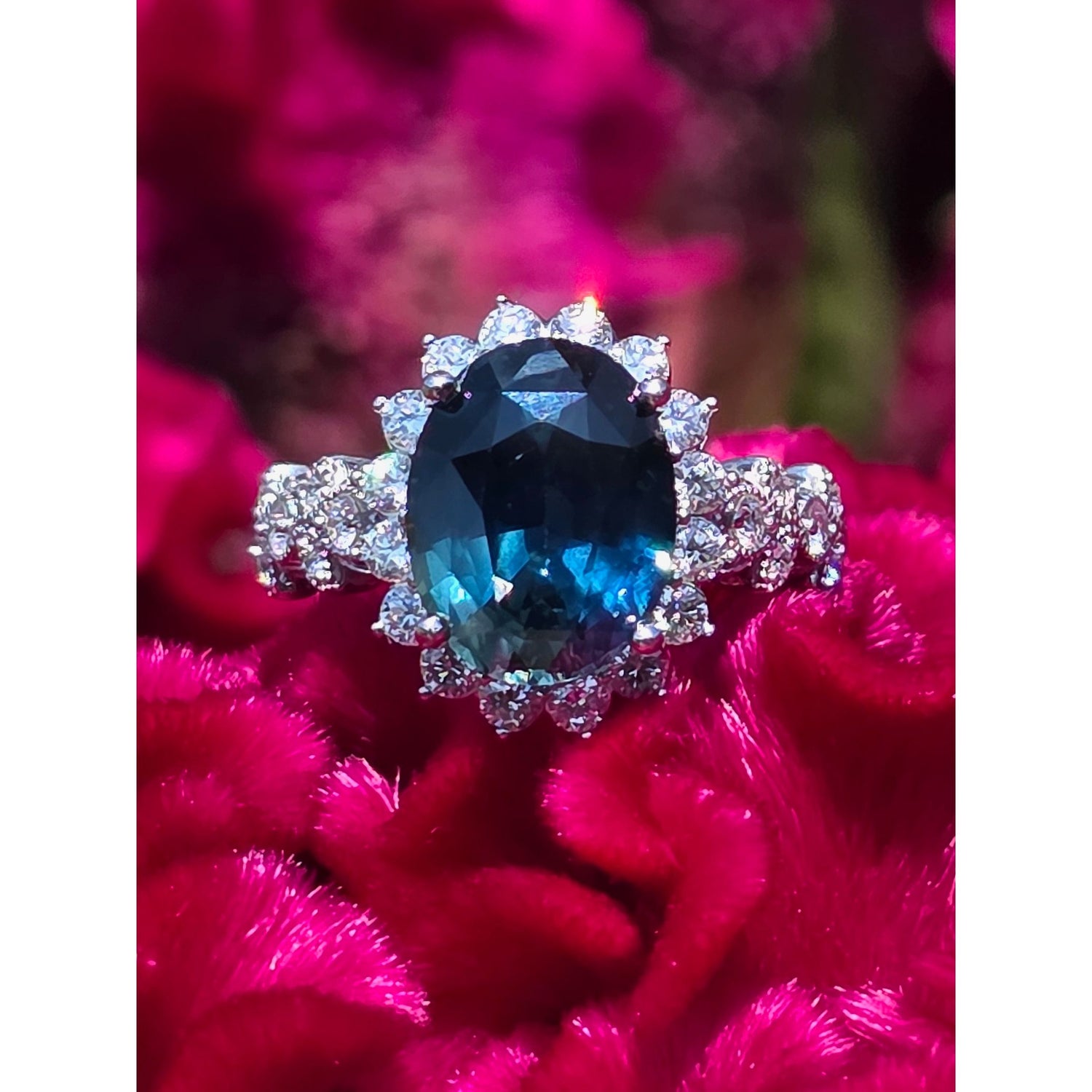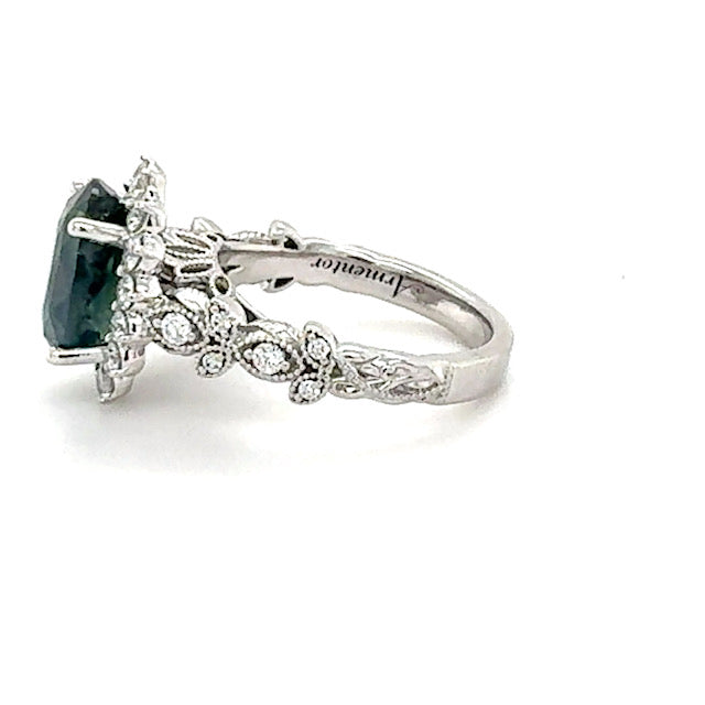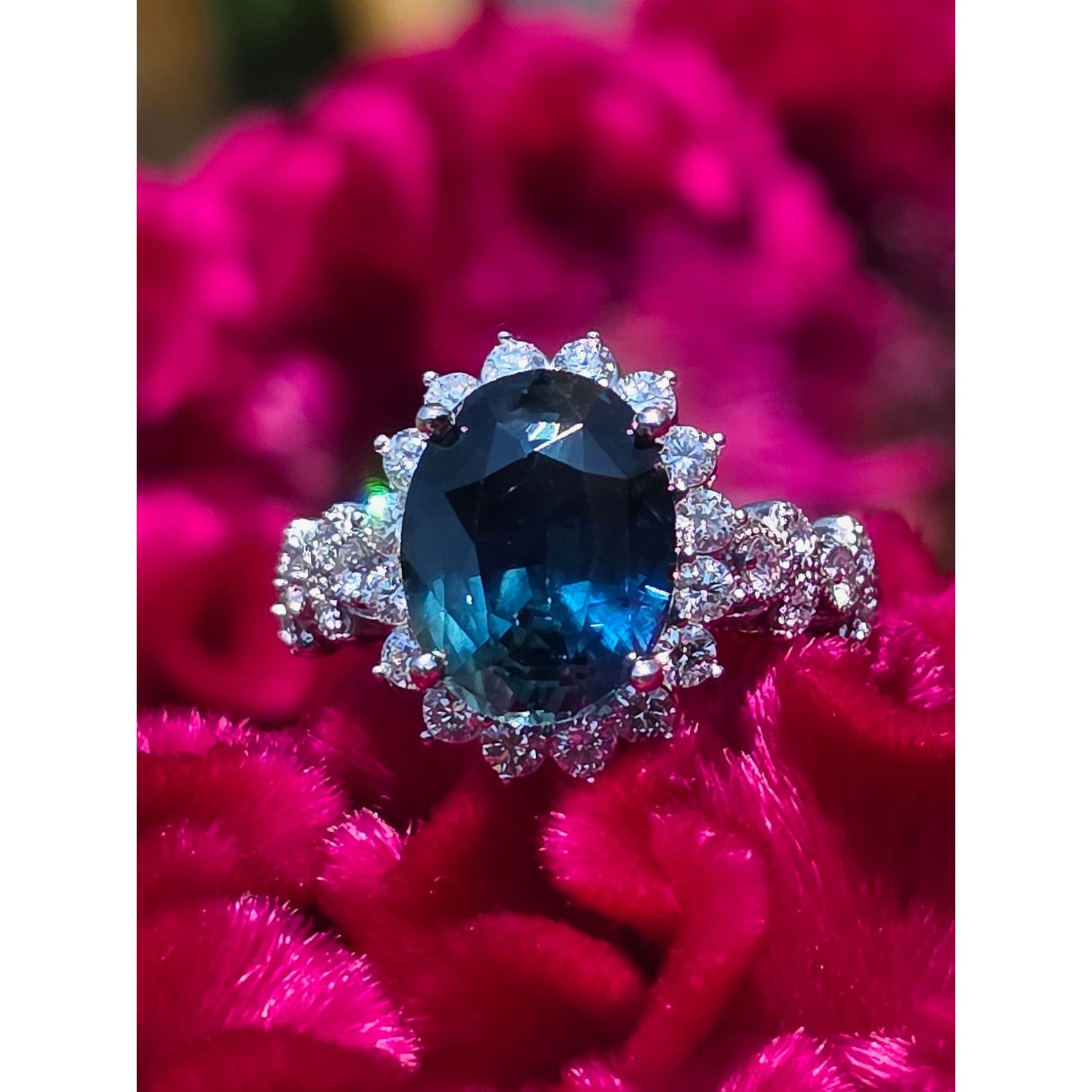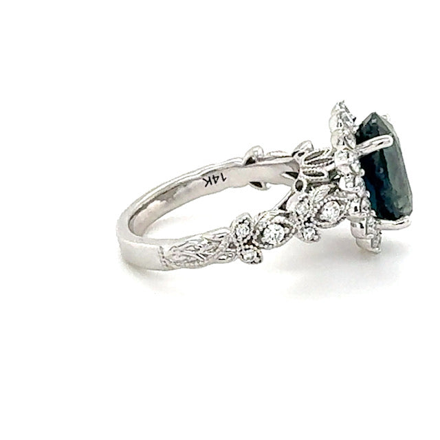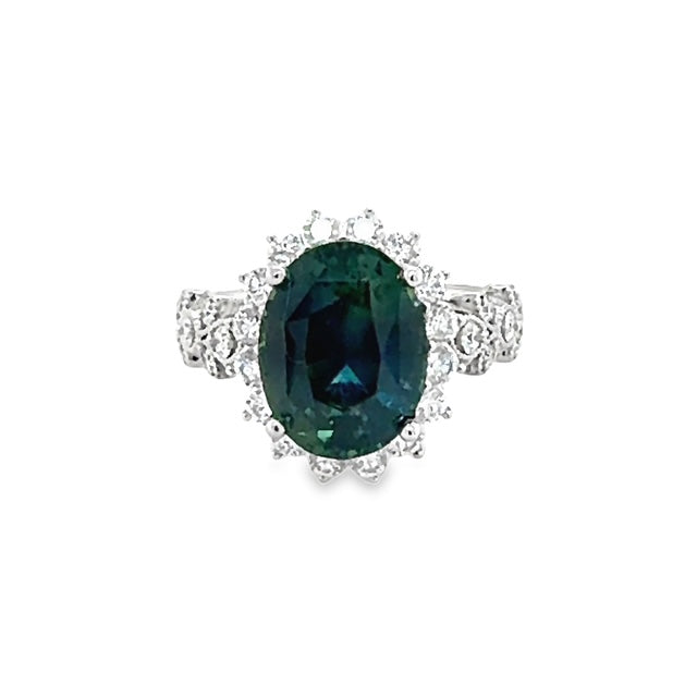 5.6 Ct Teal Natural Sapphire Ring with Natural Diamond Accents Set in 14Kt White Gold