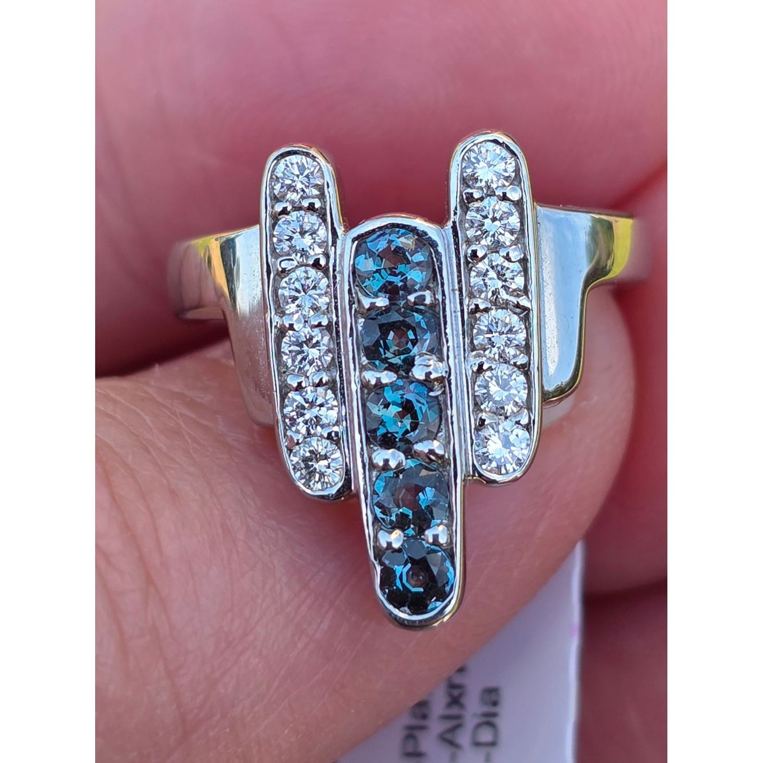 Stunning Natural Alexandrite .41 CTW with green to purple color change with .31 CTW Diamond accents in Platinum. This ring is a size 5 and can be sized up or down just contact us for a quote.