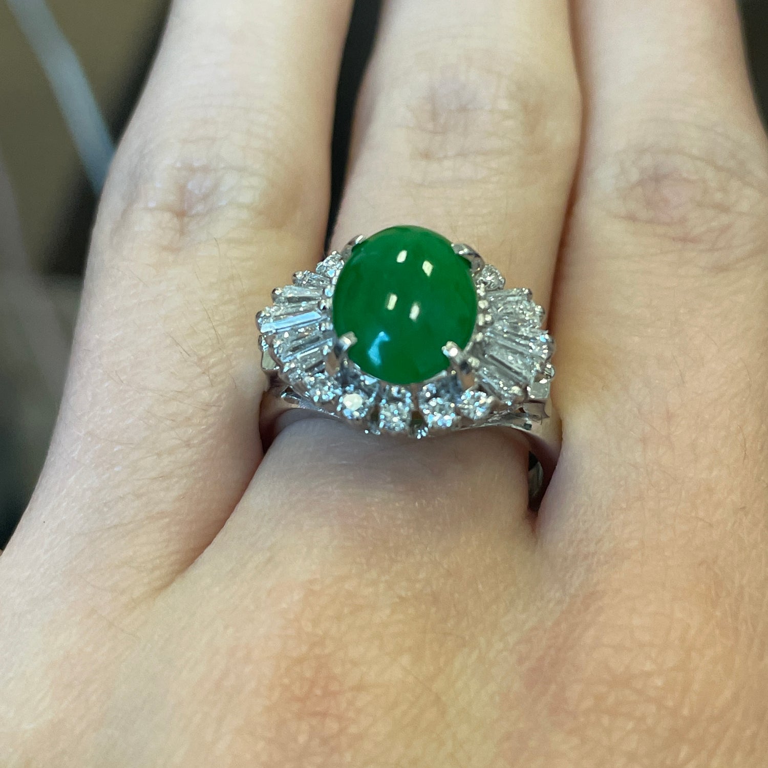 5 Ct Jade & 0.72 Ctw natural Diamond rin in Platinum ring setting. Diamonds are VS in clarity, colorless. This ring is a size 6 3/4 but can be resized if needed, just drop us a note at checkout for a quote!