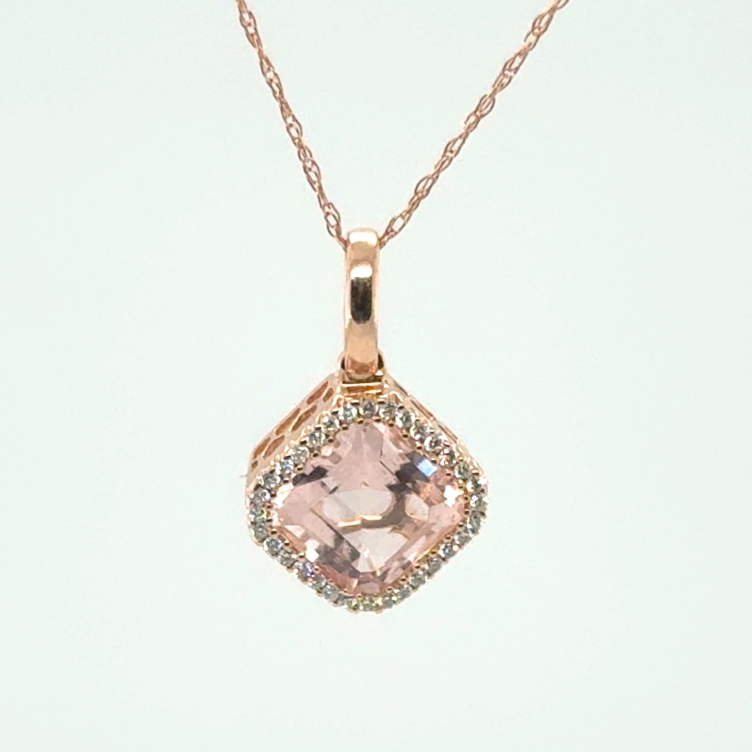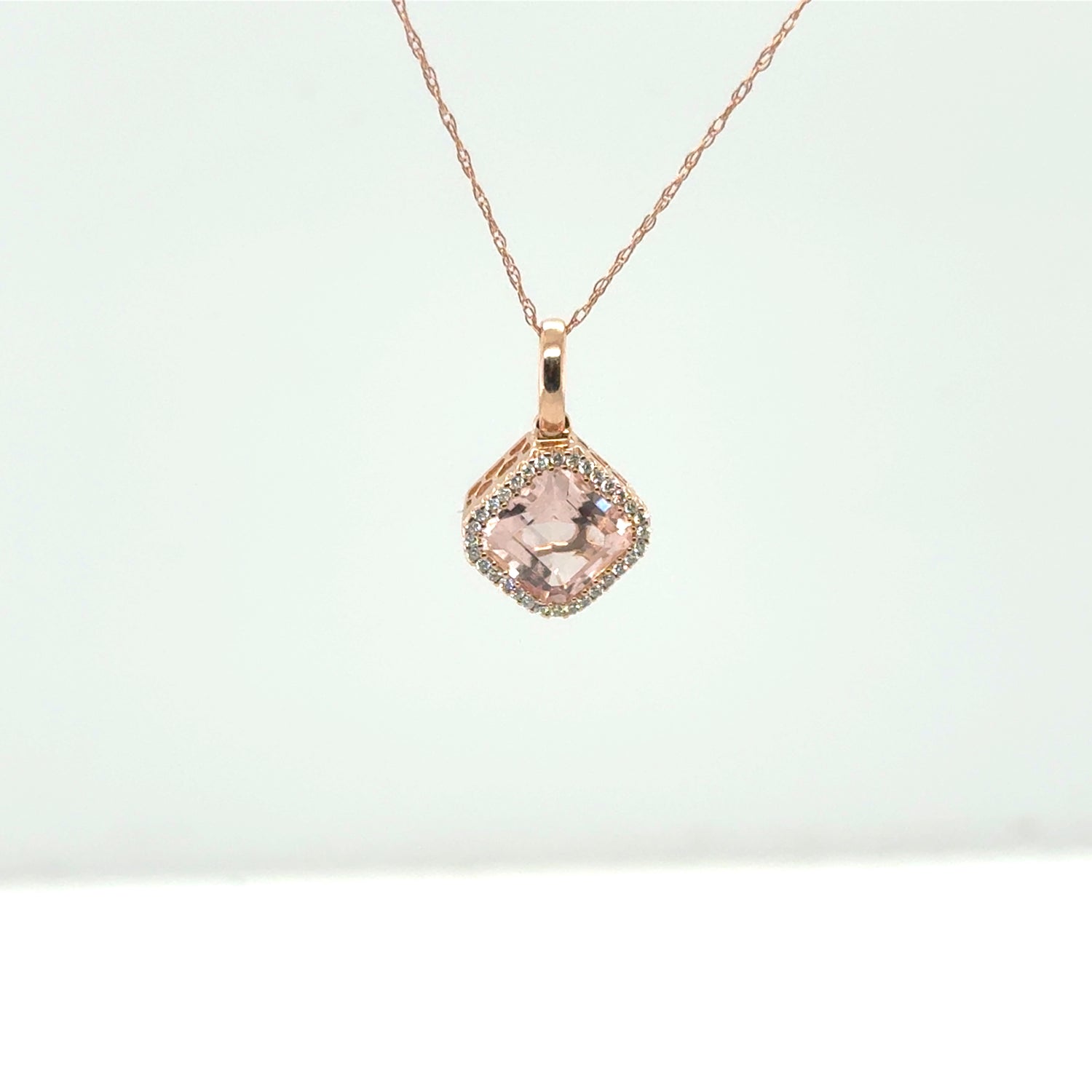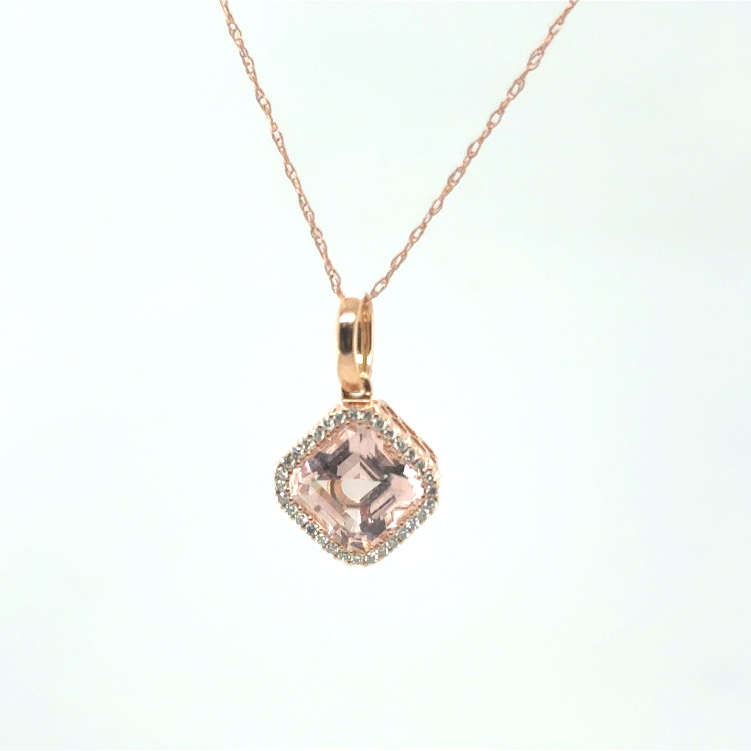 1 ct morganite with 0.10 ctw natural diamond accents, all set in 14kt rose gold. 18in chain.