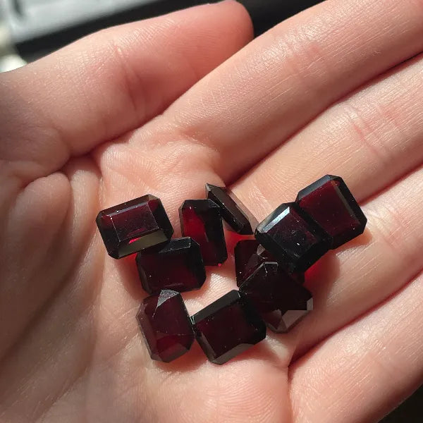 A lot of ten natural Thai garnets, each 10×5 mm and emerald-cut, exhibiting rich Thai red color and sharp, reflective facets.