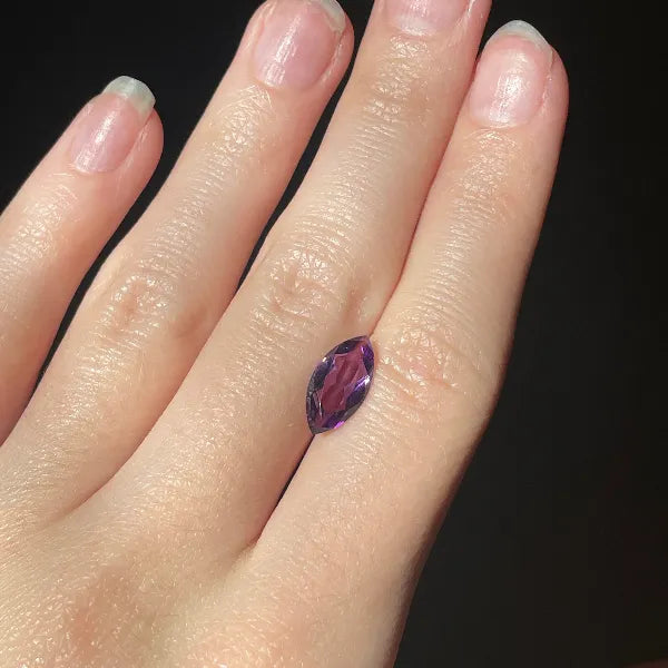A lot of ten natural amethyst stones, each 12×6 mm and marquise-cut, featuring rich purple color and brilliant, elongated facets.