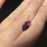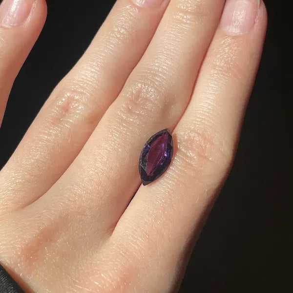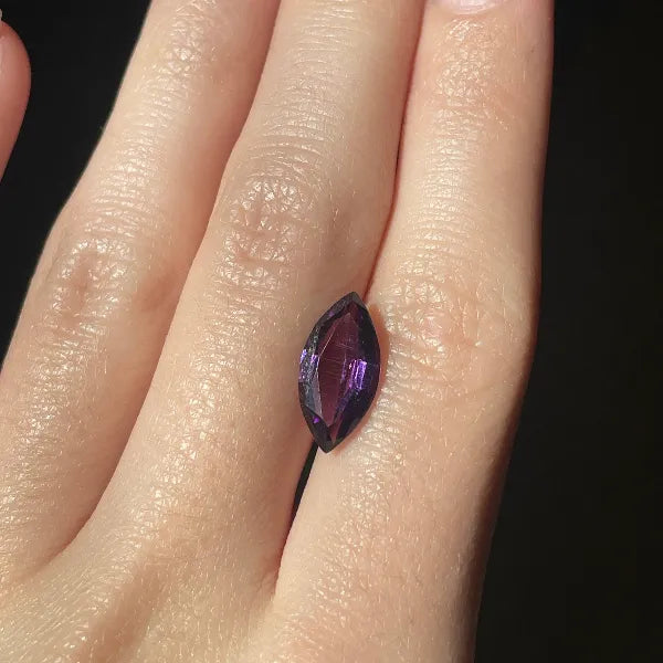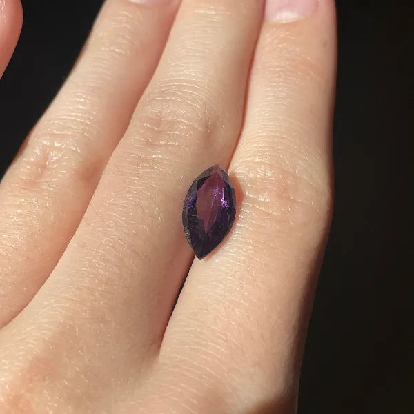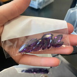 A lot of ten natural amethyst stones, each 14×7 mm and marquise-cut, showcasing deep purple color and sparkling, well-proportioned facets.