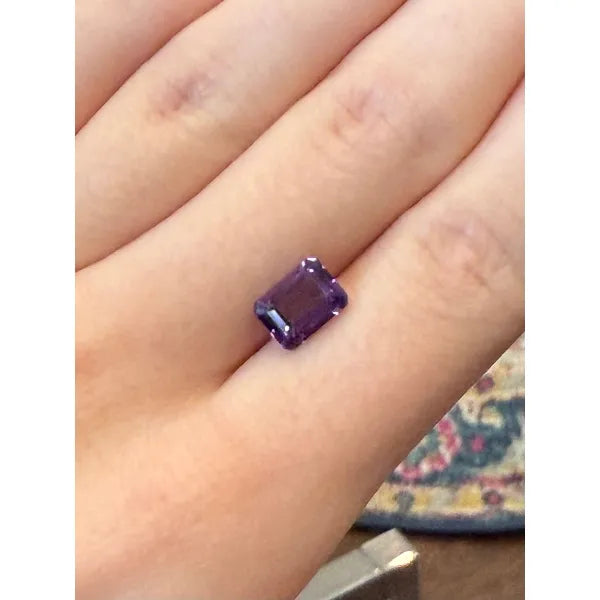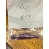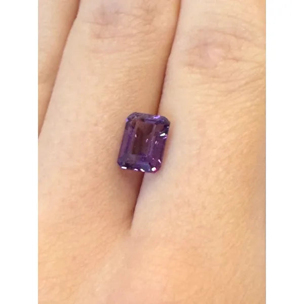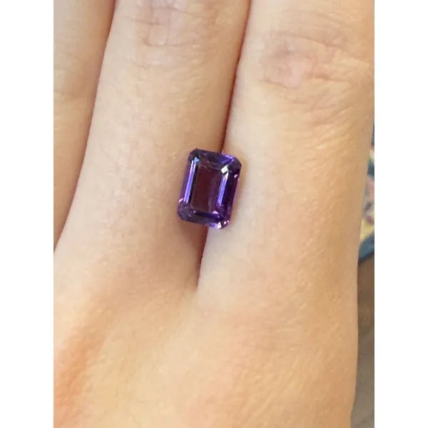A lot of ten amethyst stones, each 8×6 mm and emerald-cut, showcasing vibrant purple color and clean, sharp facets.