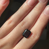A lot of ten Thai garnet stones, each 10×8 mm and emerald-cut, featuring rich red color and sharp, sparkling facets.