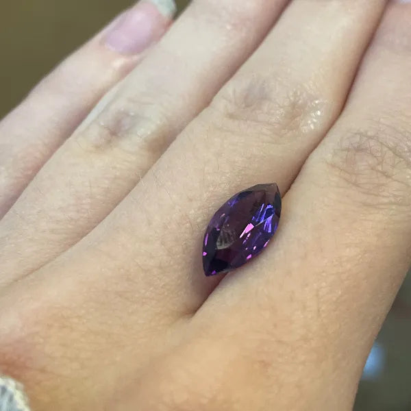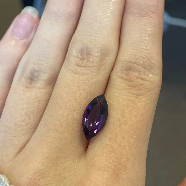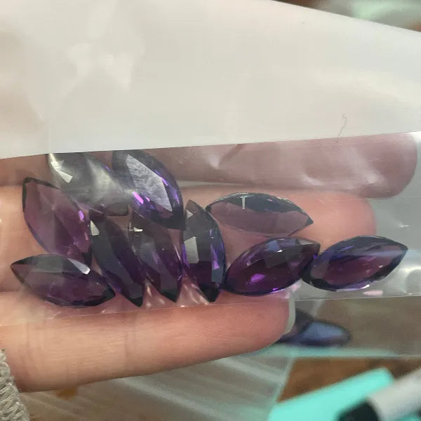 A lot of ten natural amethyst stones, each 14×7 mm and marquise-cut, featuring vibrant purple color and brilliant, symmetrical facets.