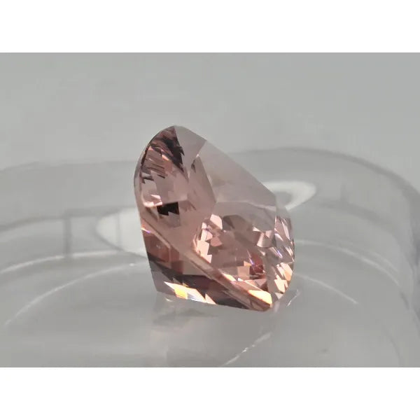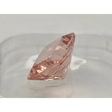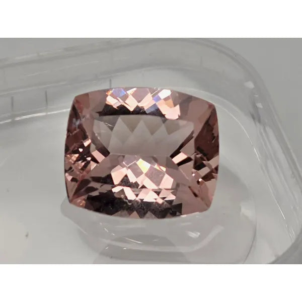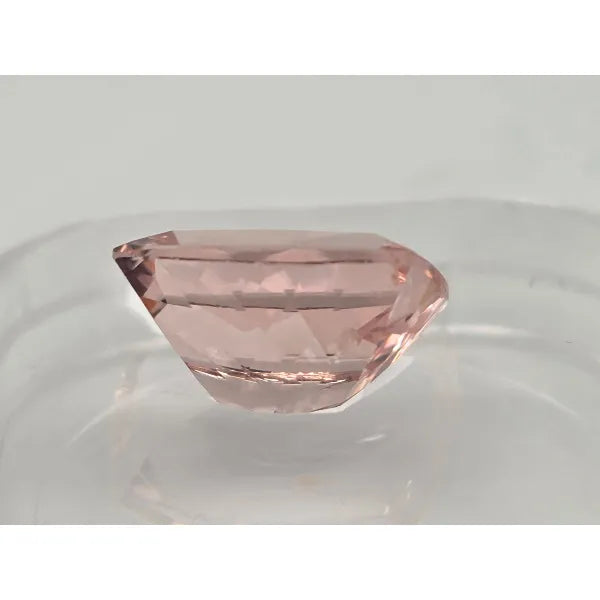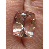 A 7.75 CT natural morganite, cushion-cut, measuring 14×12 mm, showcasing soft peach-pink color and brilliant clarity.