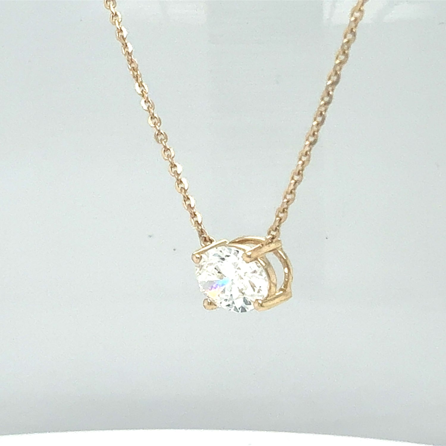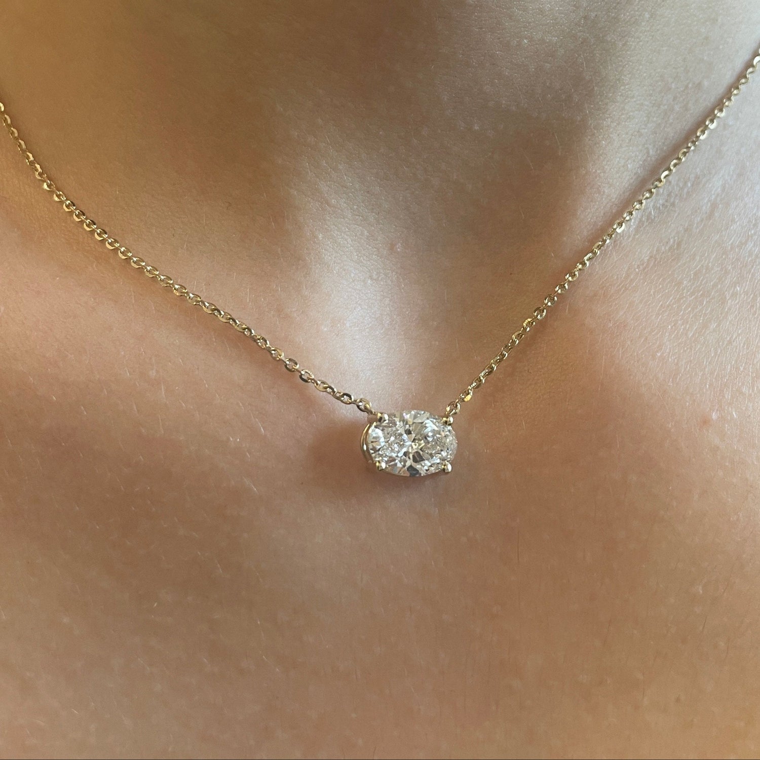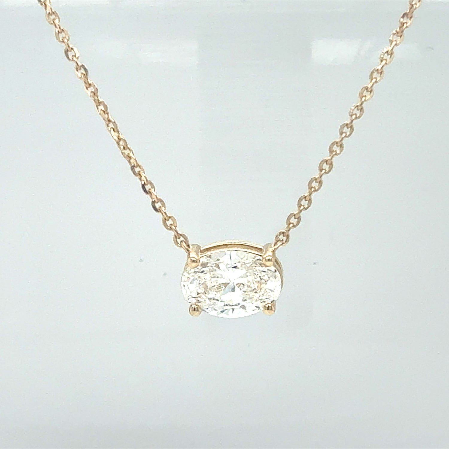 1.5 Ct Oval shaped LAB Diamond. VS in clarity, colorless. Set in your choice of 14kt yellow or white gold. 18 in chain.