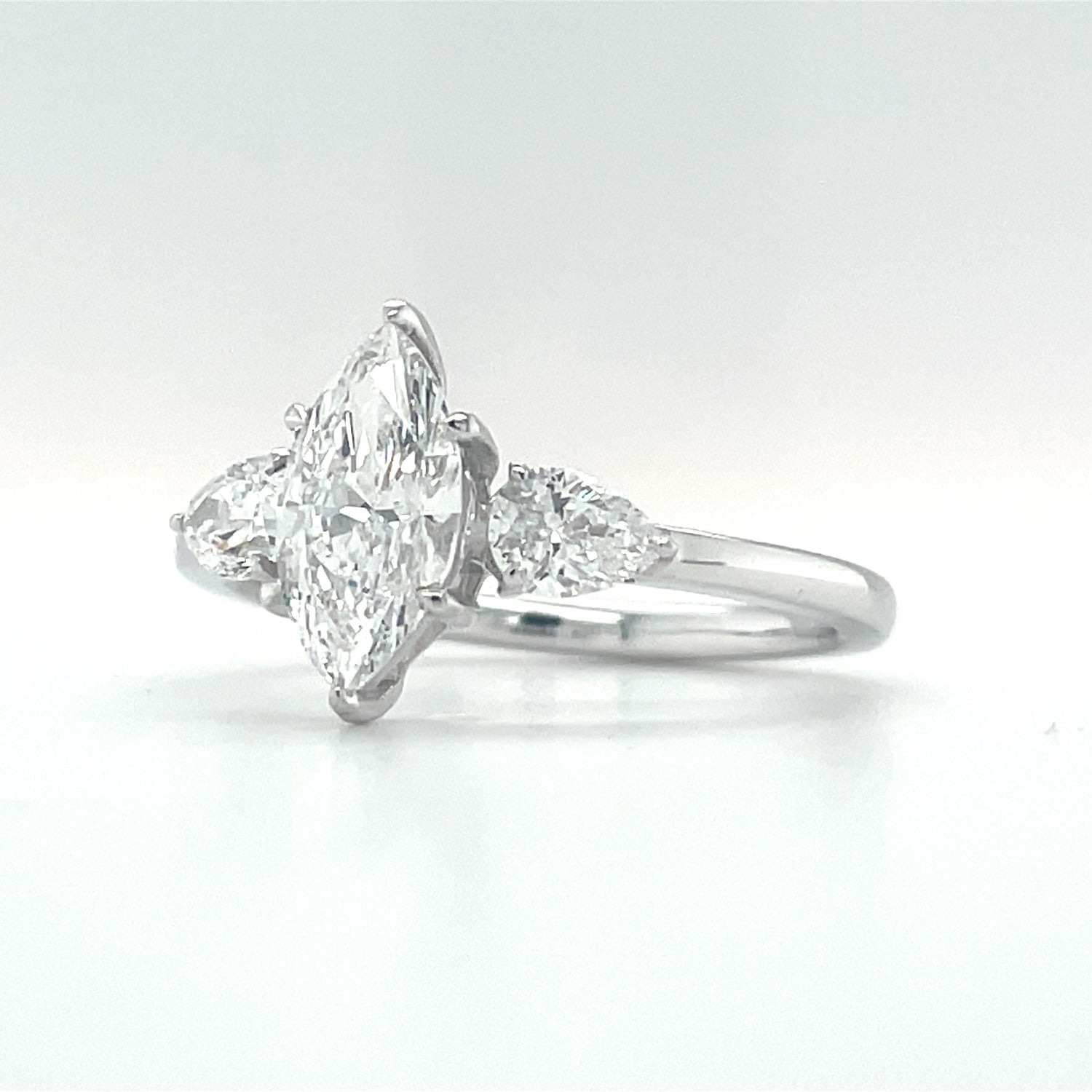 1.54 Ctw LAB Diamond marquis cut 3 stone ring in 14kt white gold ring setting. 1.05 Ct center marquis cut LAB Diamond E VS1 & 1/4 Ct each side pear cut diamond accents. This ring is a size 7.5 but can be resized if needed, just drop us a note at checkout for a quote!