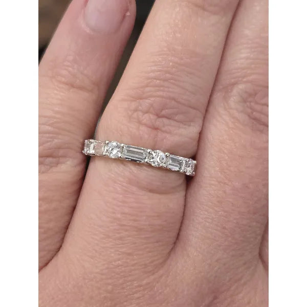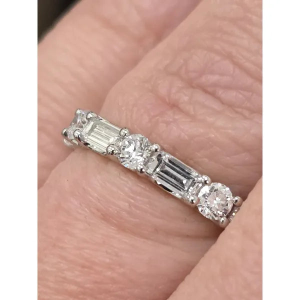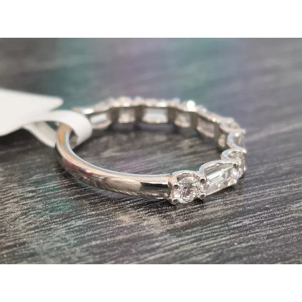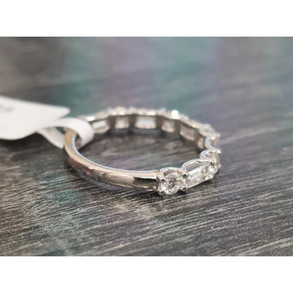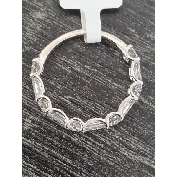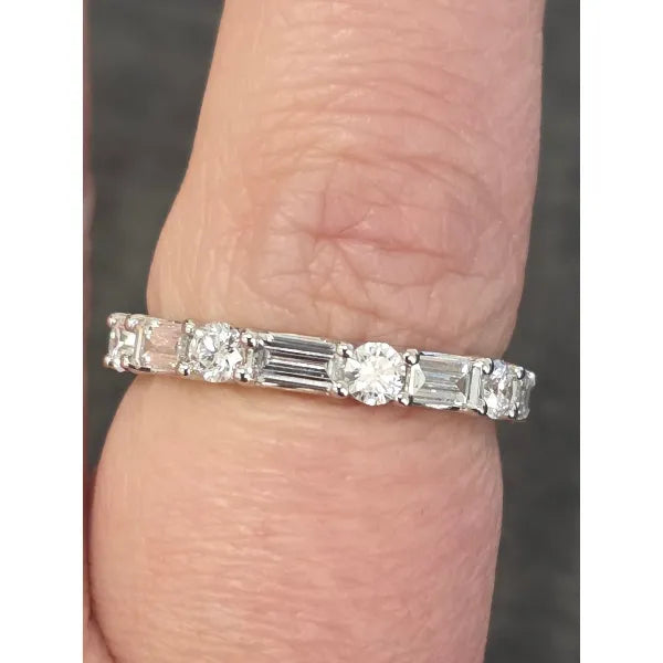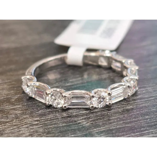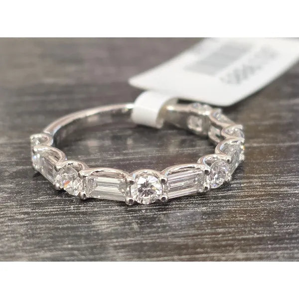 A 1.5 ctw LAB diamond half-eternity band in 14 kt gold features a mix of round and elongated baguette diamonds for a unique and elegant sparkle. Its sophisticated design offers timeless beauty for everyday wear or special occasions.