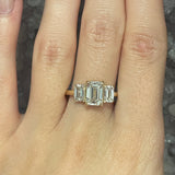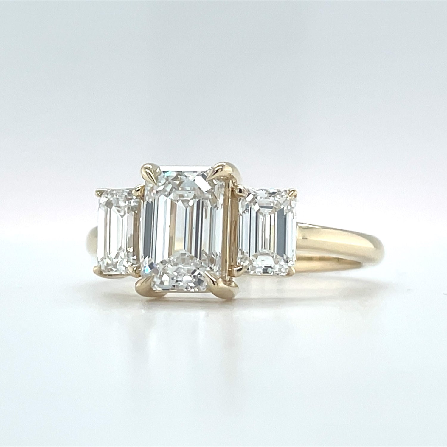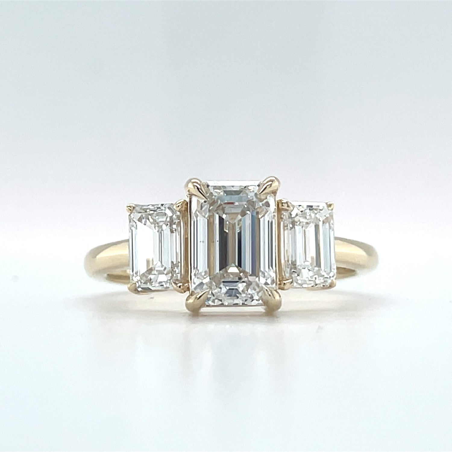 1.54 Ct LAB center Diamond Emerald cut D VS2 & LAB Diamond accents set in 14kt yellow gold ring setting. This ring is a size 7 but can be resized if needed, just drop us a note at checkout for a quote!