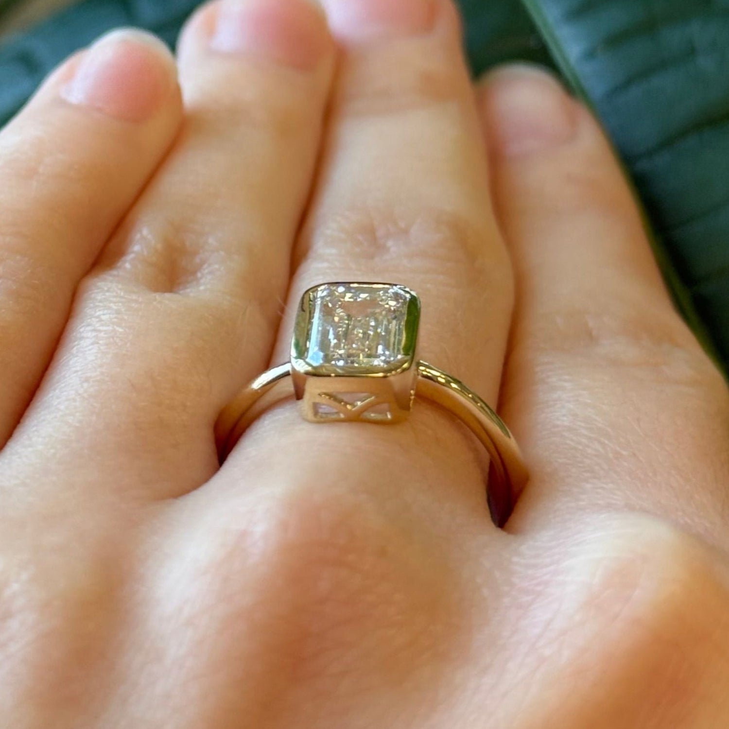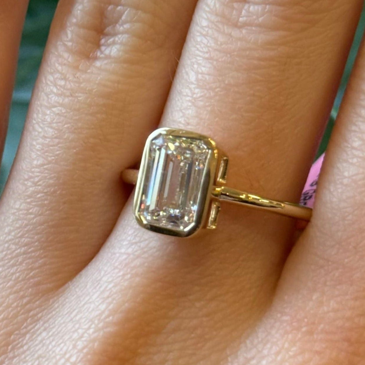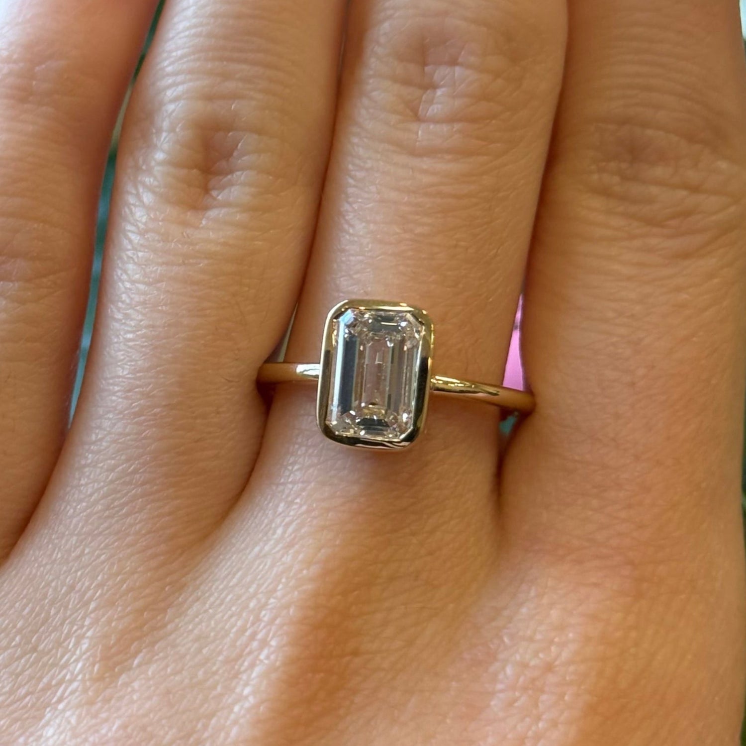 2 ctw LAB diamond, bezel set emerald cut. All set in 14kt yellow gold setting. This ring is a size 7 but can be resized if needed, just drop us a note at checkout for a quote!