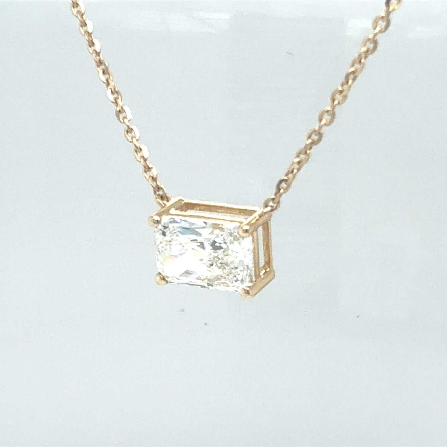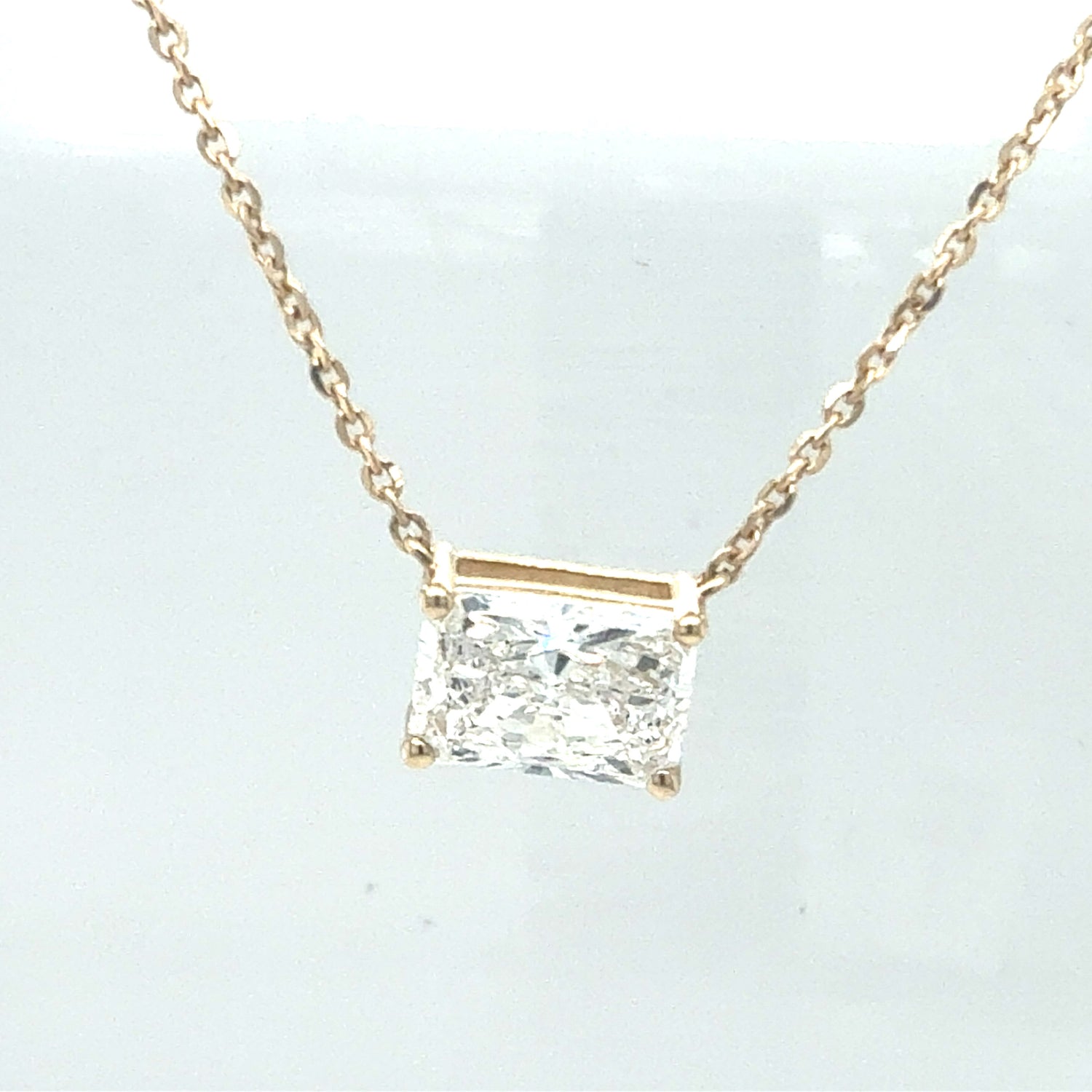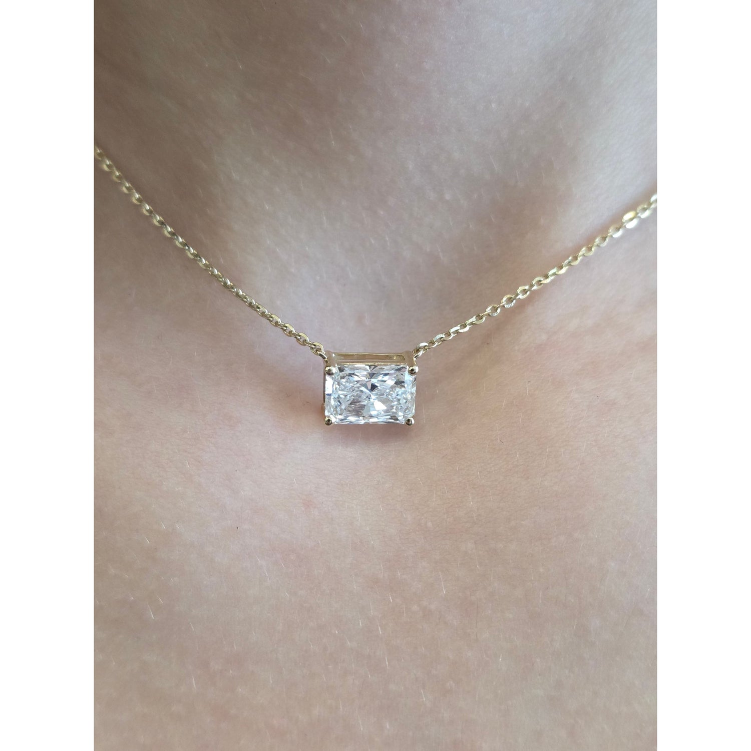2 Ctw LAB radiant cut prong set, east west Diamond necklace in your choice of yellow or white 14kt gold. Diamonds are VS, Colorless. 16in chain.