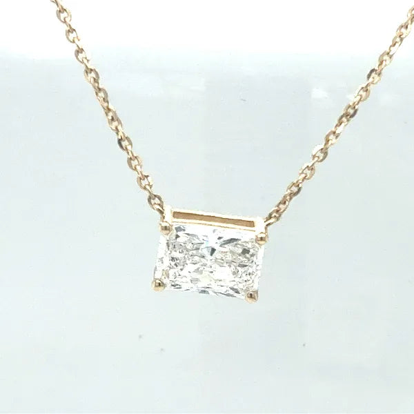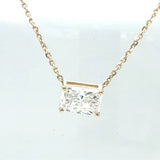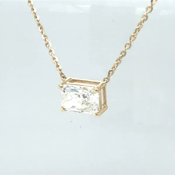 This elegant 2 Ctw lab-grown radiant cut diamond necklace features diamonds set in a prong setting with an East-West orientation. Available in your choice of yellow or white 14kt gold, the diamonds are VS clarity and colorless, offering exceptional sparkle. The necklace comes with a 16-inch chain, making it a versatile and sophisticated addition to any jewelry collection.