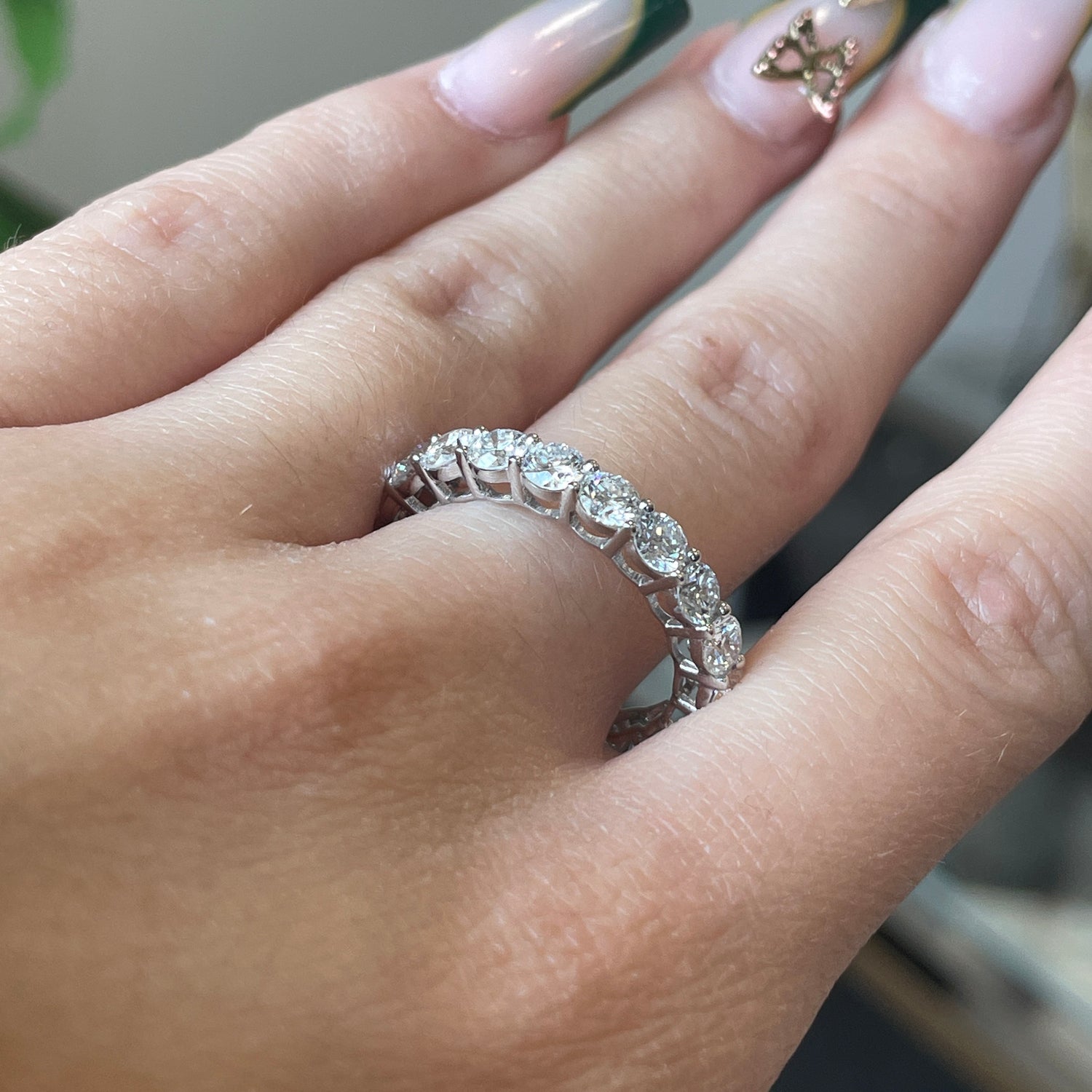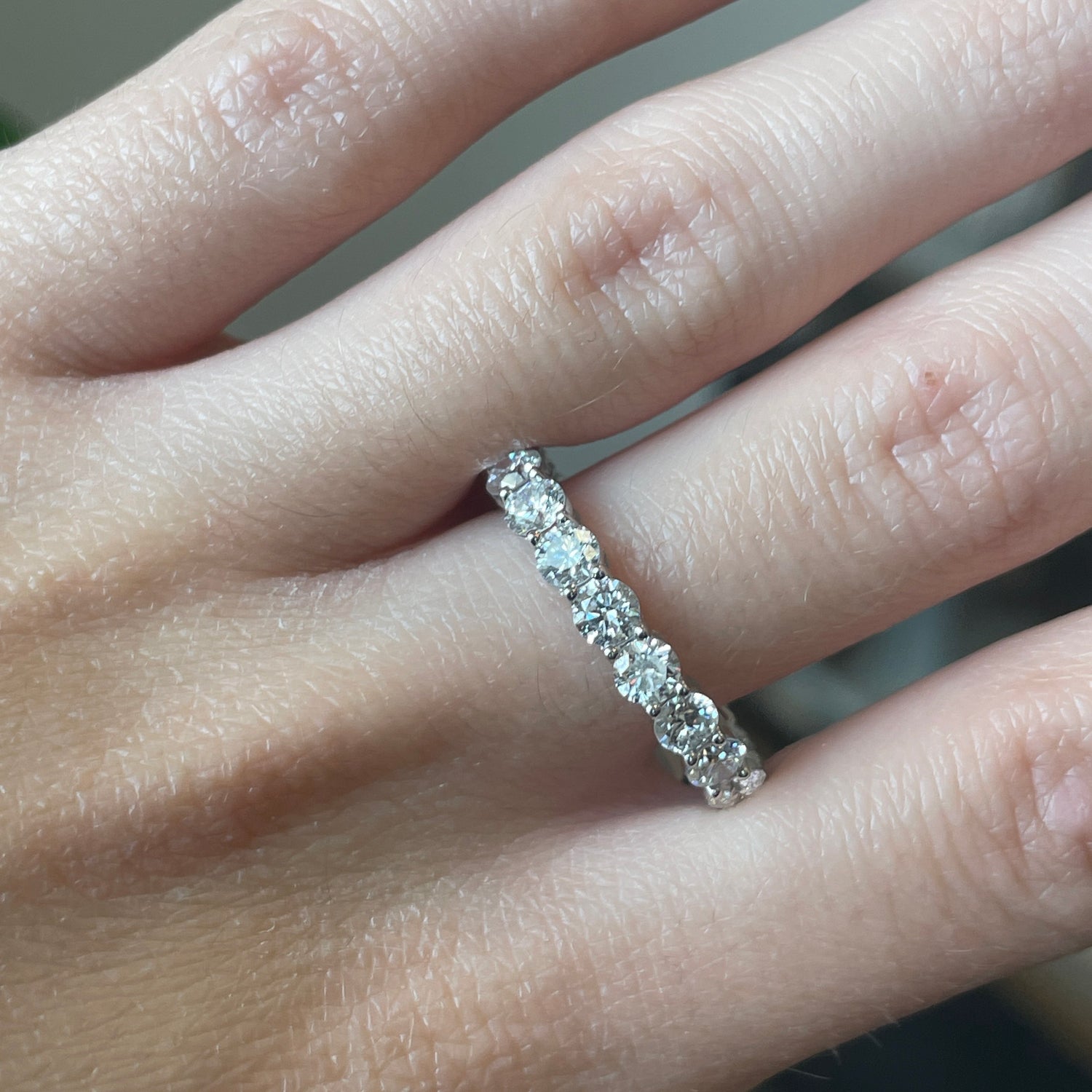 3.1 Ctw LAB Diamond eternity band in 14kt white gold. Diamonds are D-F in color, VS in clarity. This ring is a size 7 1/4 but can be resized if needed, just drop us a note at checkout for a quote!