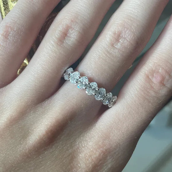 This exquisite 4ctw lab-grown oval diamond eternity band is set in a sleek 14kt white gold basket setting for a seamless, radiant look. Featuring diamonds graded D–F in color and VS clarity, it delivers exceptional brilliance and elegance from every angle. A timeless symbol of love and luxury.