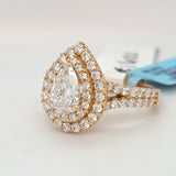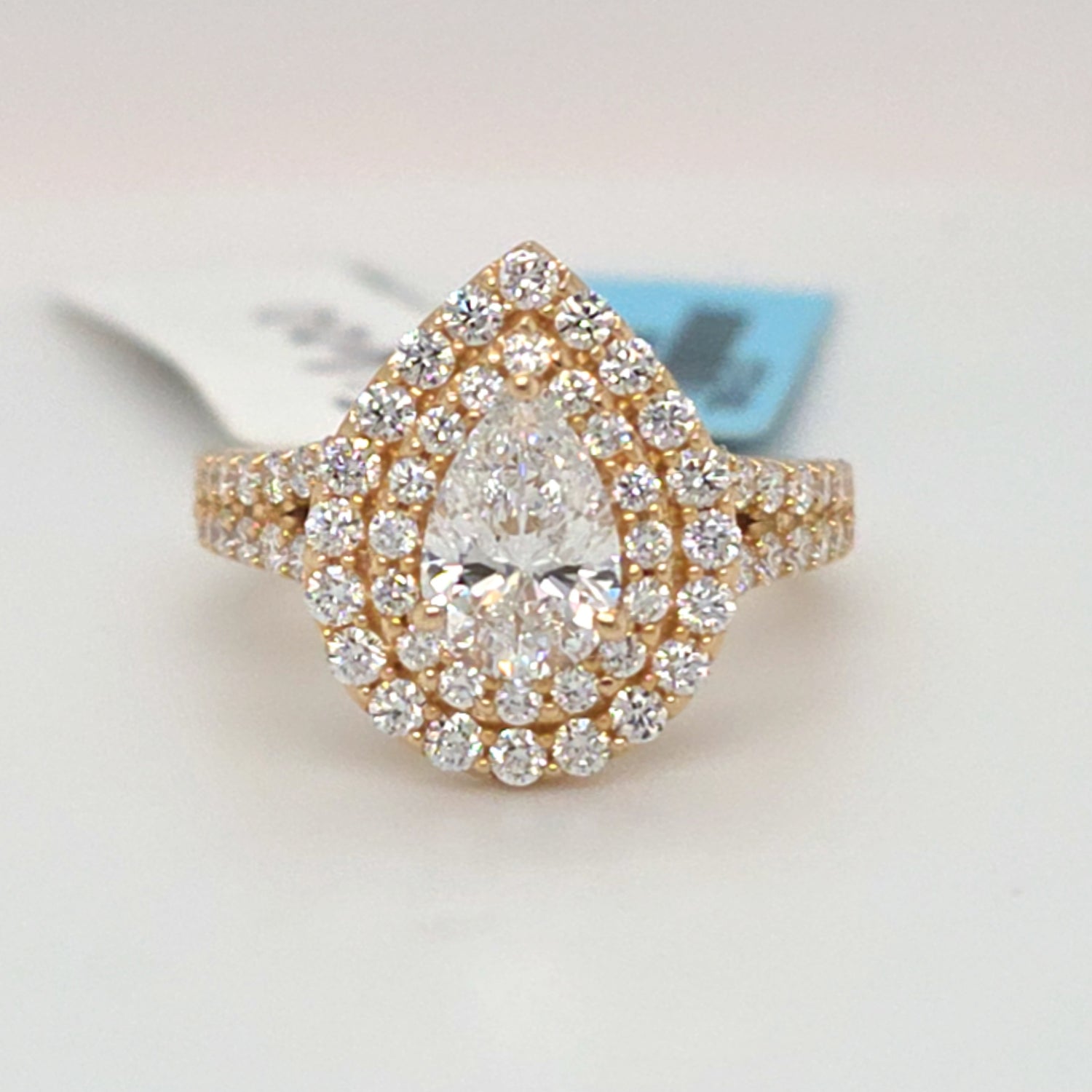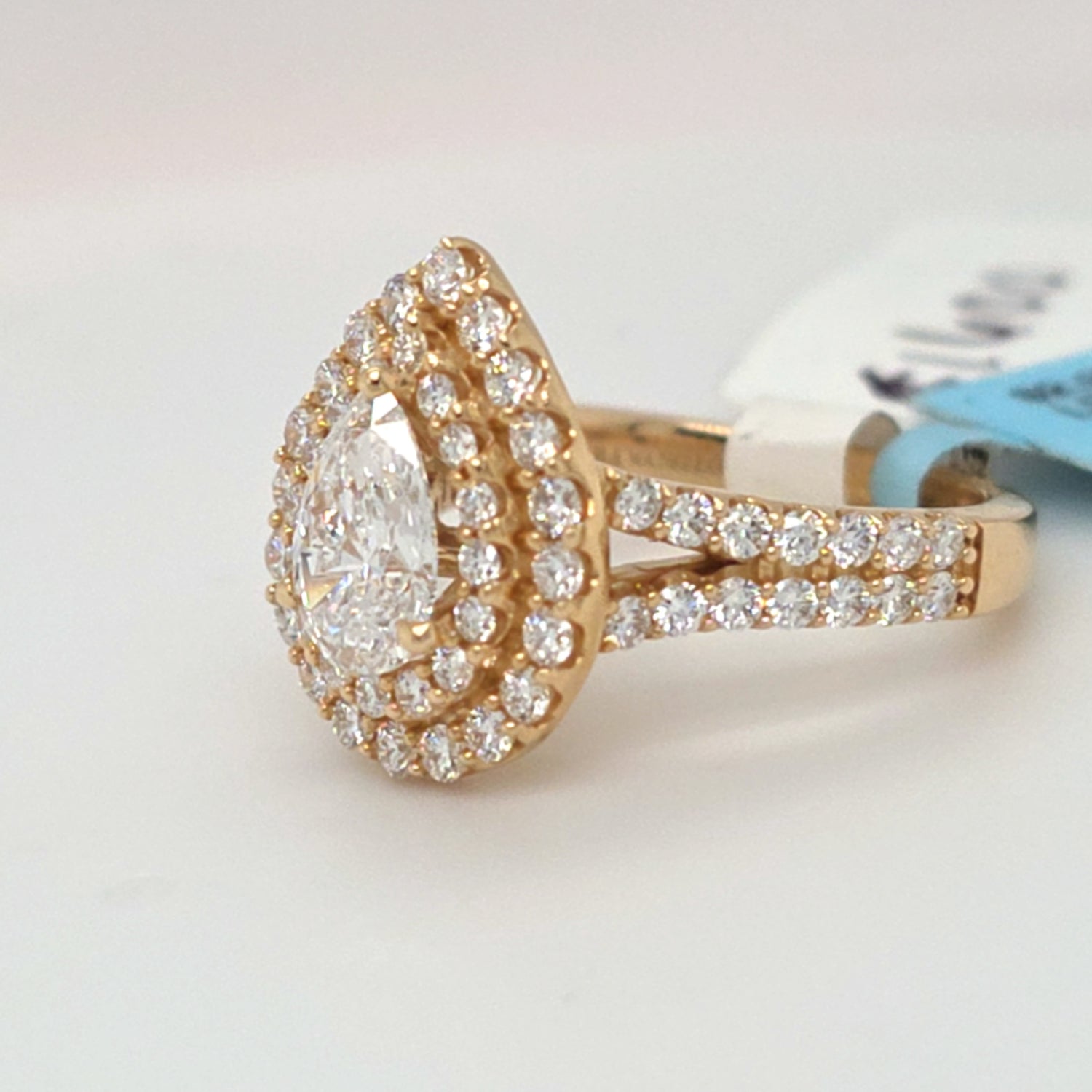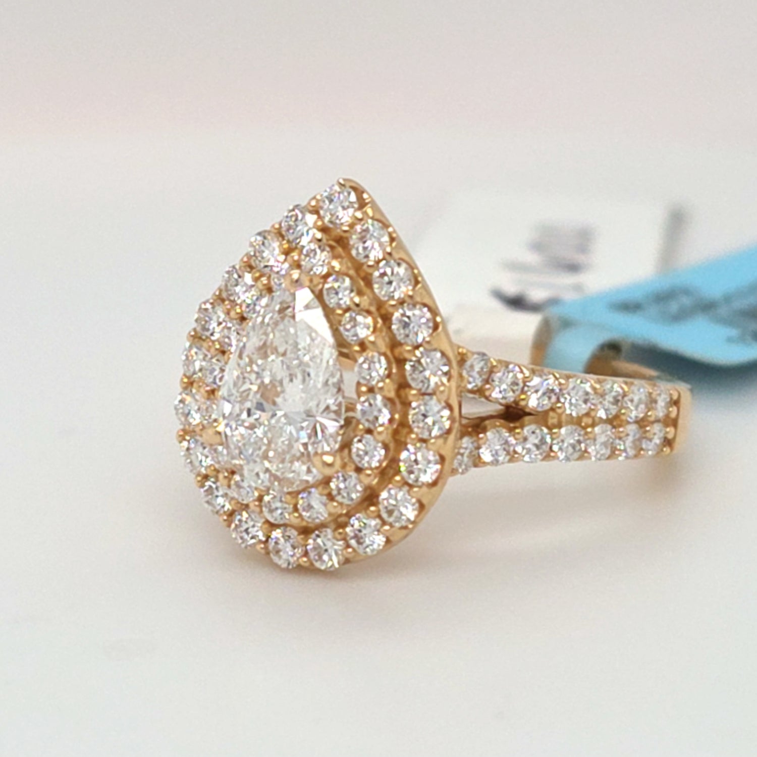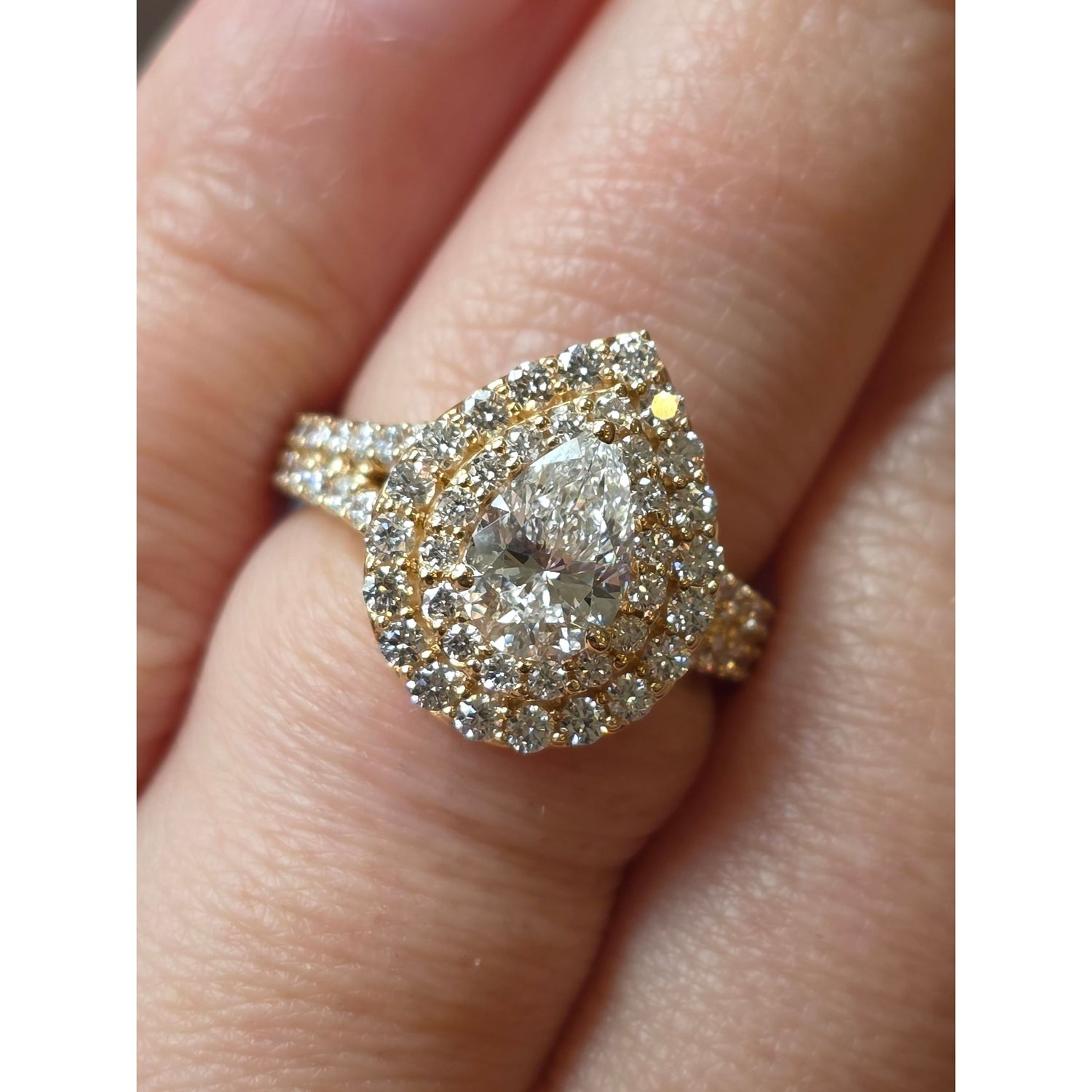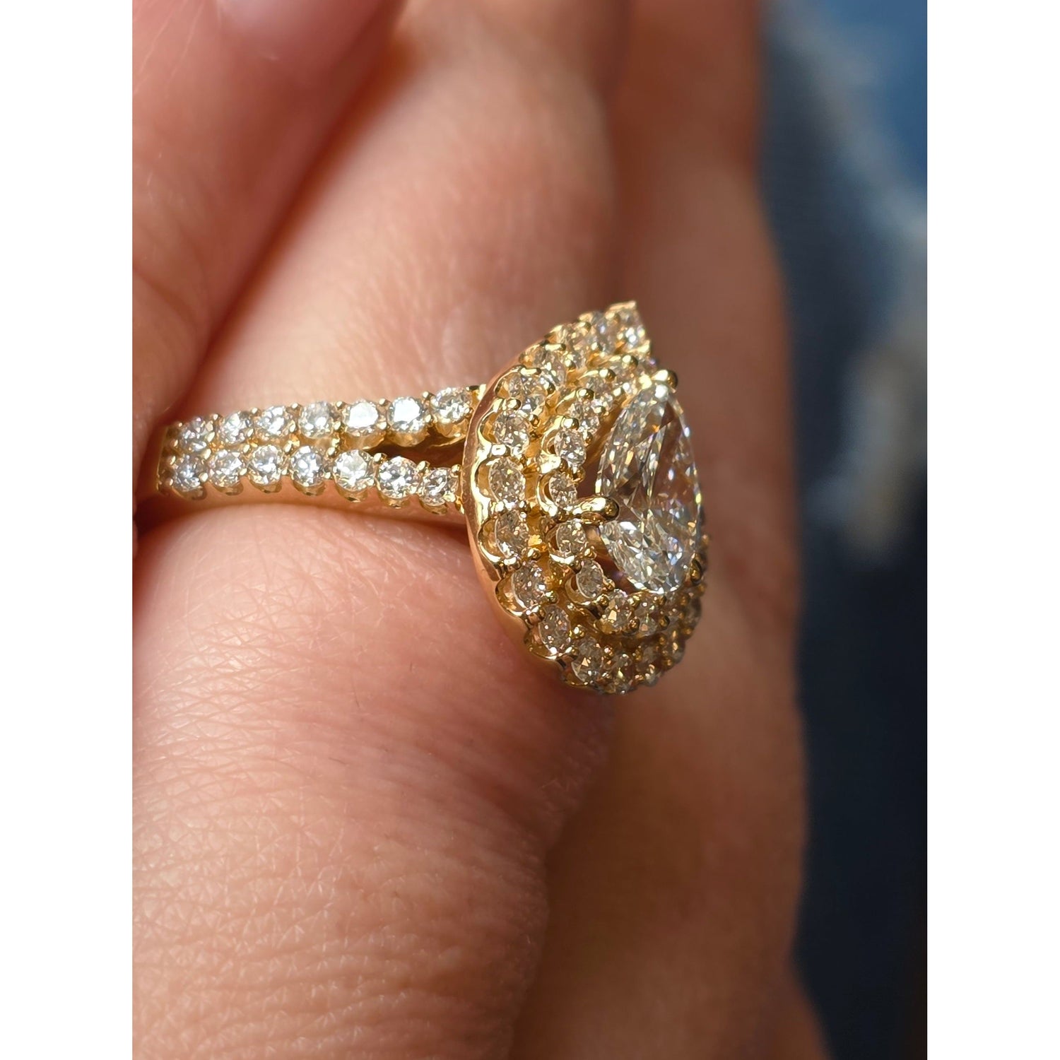 2 Ctw LAB Diamond ring in 14kt yellow gold made by Vera Wang. 1 Ct Center pear shaped LAB Diamond. 6g total weight. This ring is a size 6 but can be resized if needed, just drop us a note at checkout for a quote!