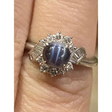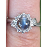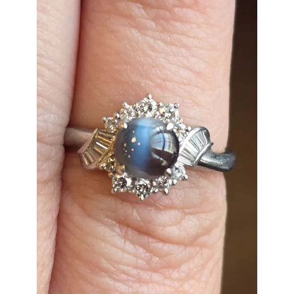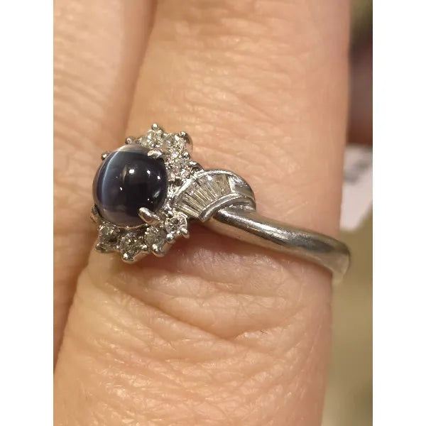 A 1.05 ct cat’s eye alexandrite takes center stage in this platinum ring, complemented by 0.33 ct total weight natural diamonds for added sparkle. Its unique color-shifting beauty and elegant design make it truly remarkable.