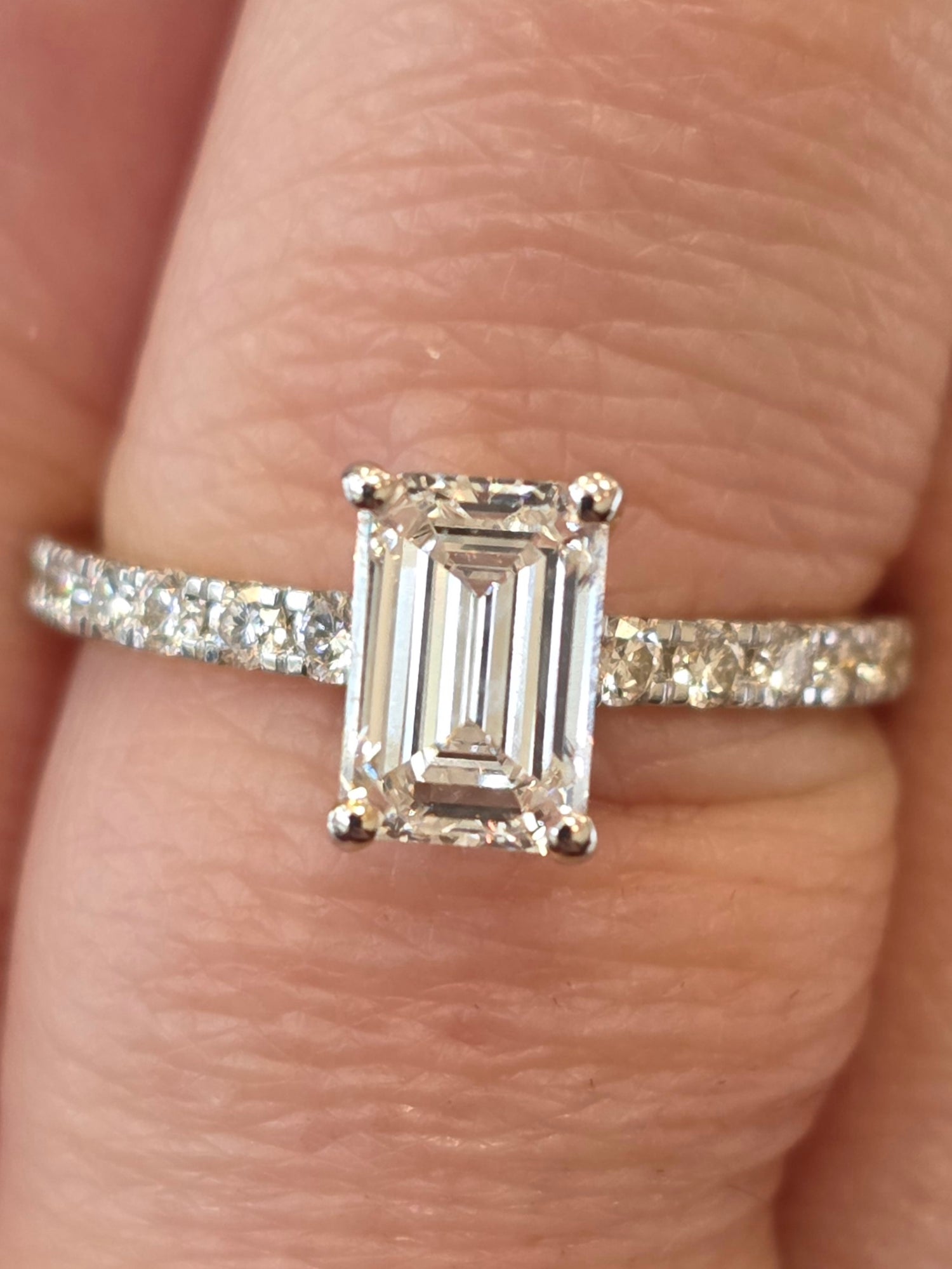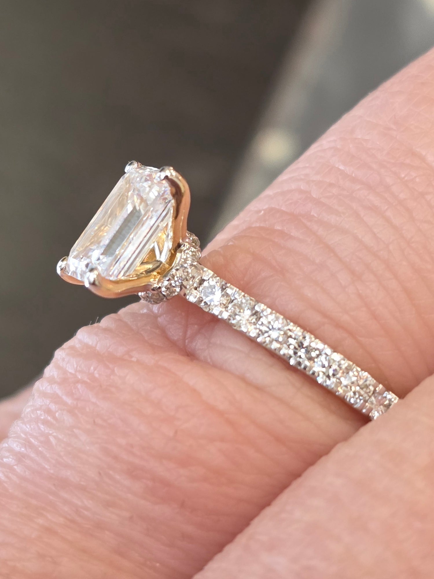 1.5ctw LAB diamond emerald cut hidden halo 14kt yellow gold ring . center Lab diamond is 1ct emerald cut E-F vs. Ring is a size 7 but can be sized just let us know the size needed so we can quote a price for sizing.