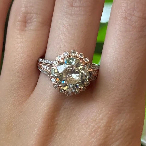 This stunning ring features a 3.71 ct center diamond with Q-R color and SI2 clarity, beautifully complemented by 1 ct of natural accent diamonds. The combination of rose and white 14kt gold creates a striking contrast that enhances the diamonds' brilliance. GIA reports included.