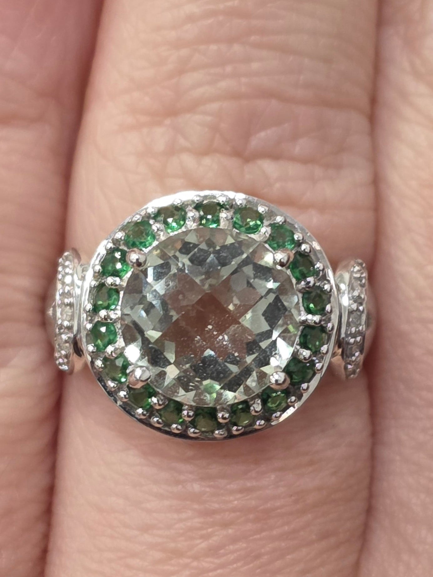 green amethyst ring with green garnets & diamond accents in 14kt white gold. Ring is a size 7.5 and can be sized just let us know the size needed so we can get you a price on sizing.