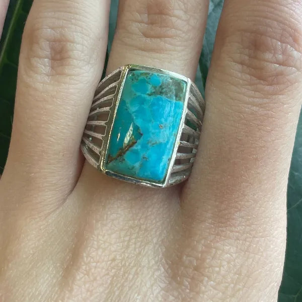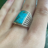 18mm x 10mm square Turquoise ring set in Sterling Silver ring setting. 7.7g total weight. This ring is a size 7 3/4 but can be resized if needed, just drop us a note at checkout for a quote!