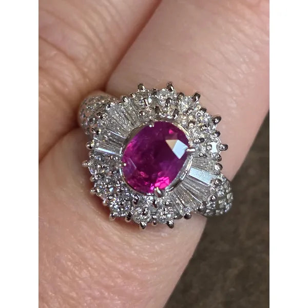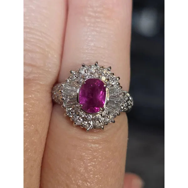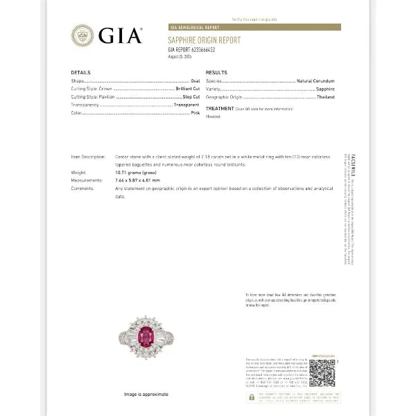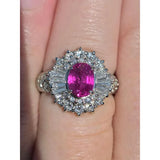 Natural 2.18 Ct GIA Certified Pink sapphire with 1.13 Ctw natural diamond accent in platinum. Ring size is 7 1/4 and this ring can be sized just contact us for a quote to size