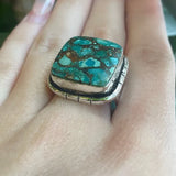 18mm x 18mm square Turquoise ring set in Sterling Silver ring setting. 8.3 g total weight. This ring is a size 7.5 but can be resized if needed, just drop us a note at checkout for a quote!