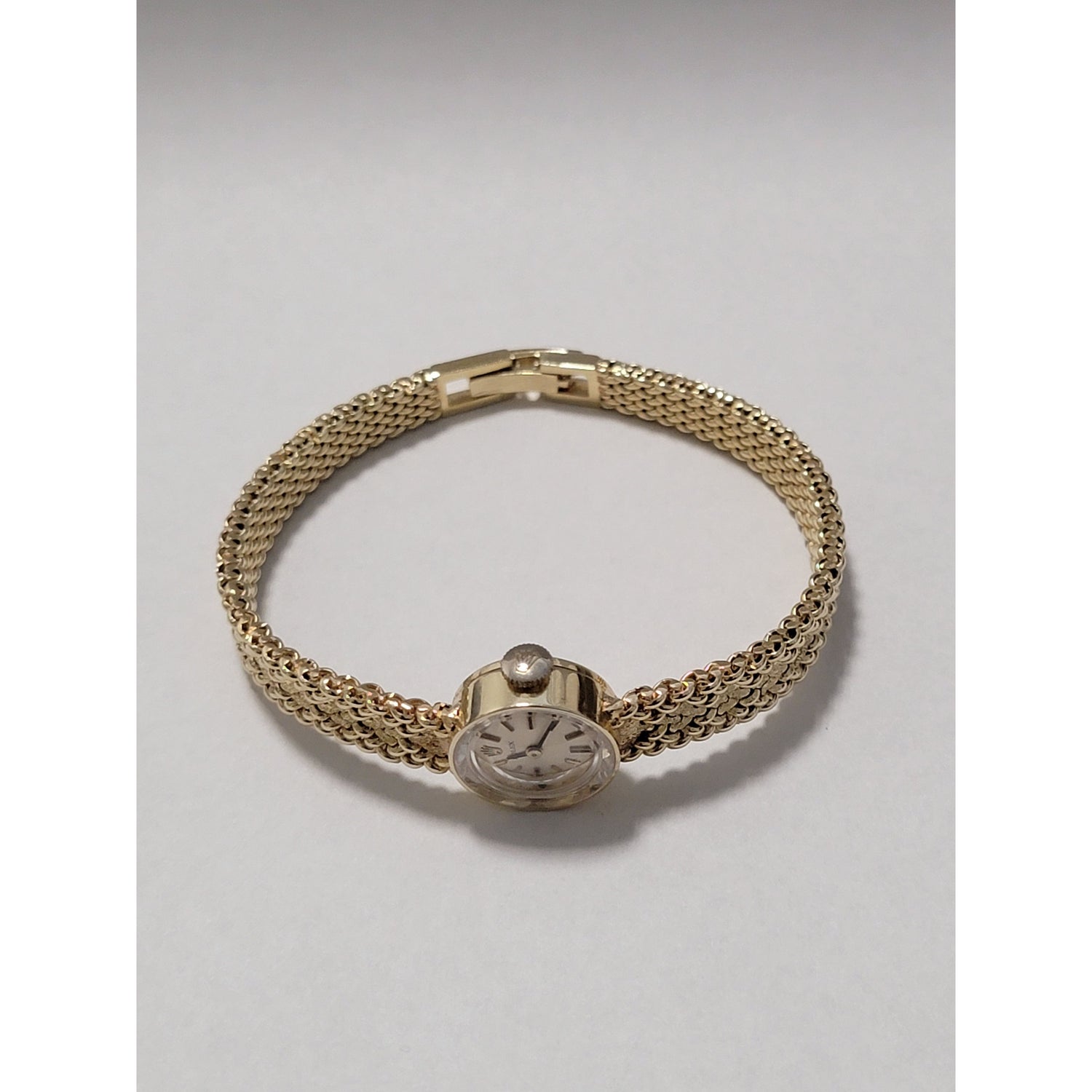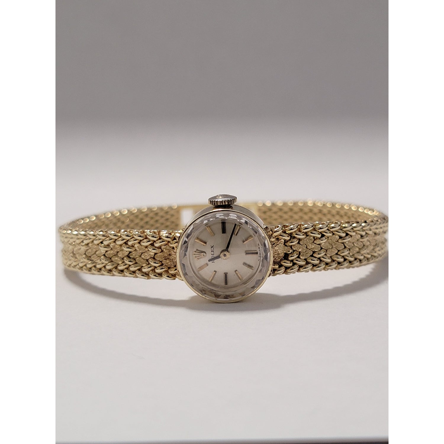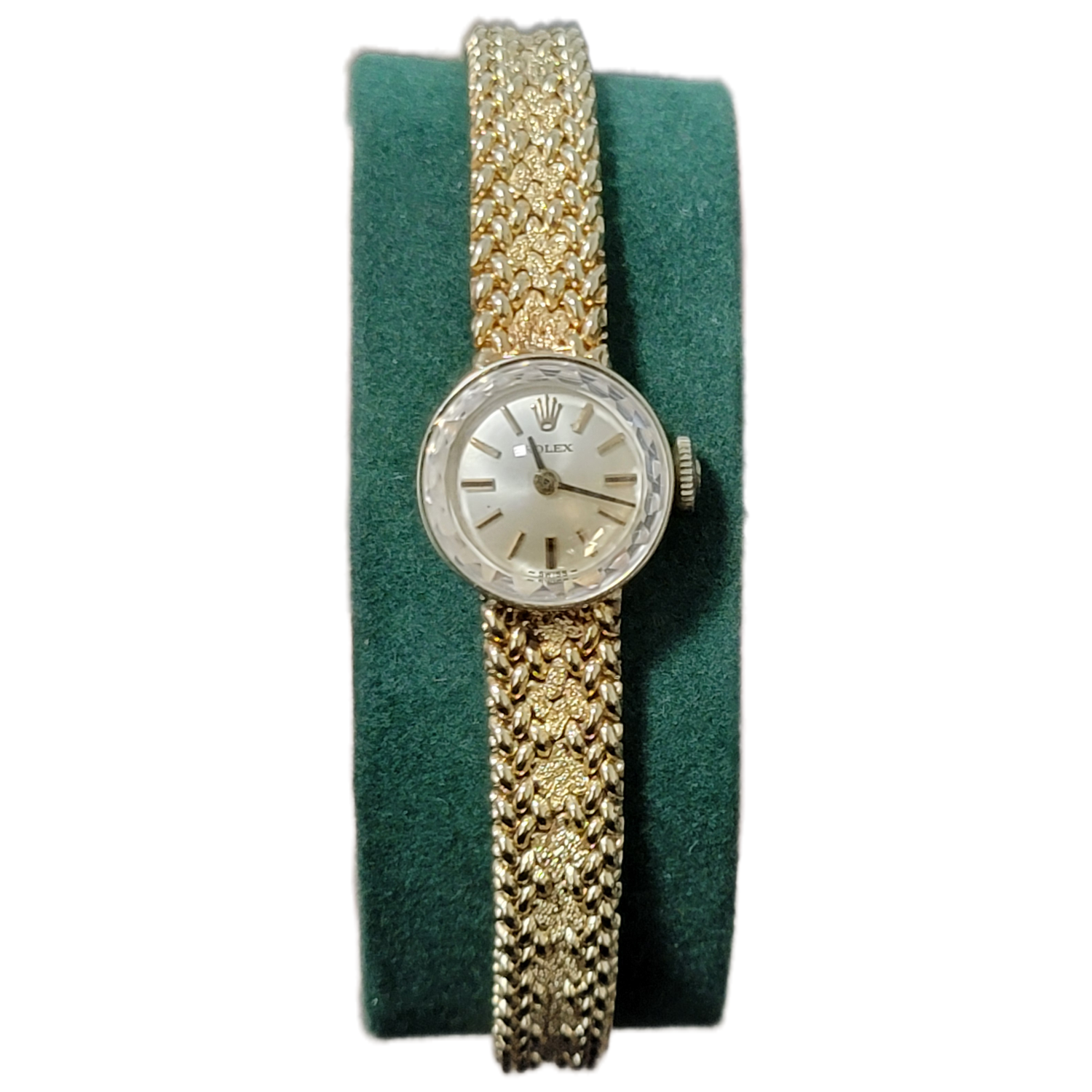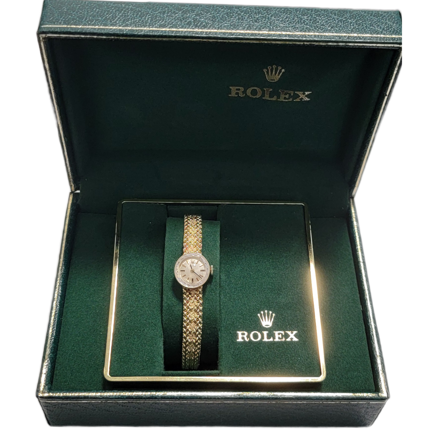 Elegant vintage ladies Rolex in solid 14kt gold, featuring a classic manual-wind movement and a beautifully woven gold bracelet. Comes complete with original Rolex box and papers, New York circa 1985. A timeless luxury piece perfect for collectors or everyday elegance.