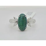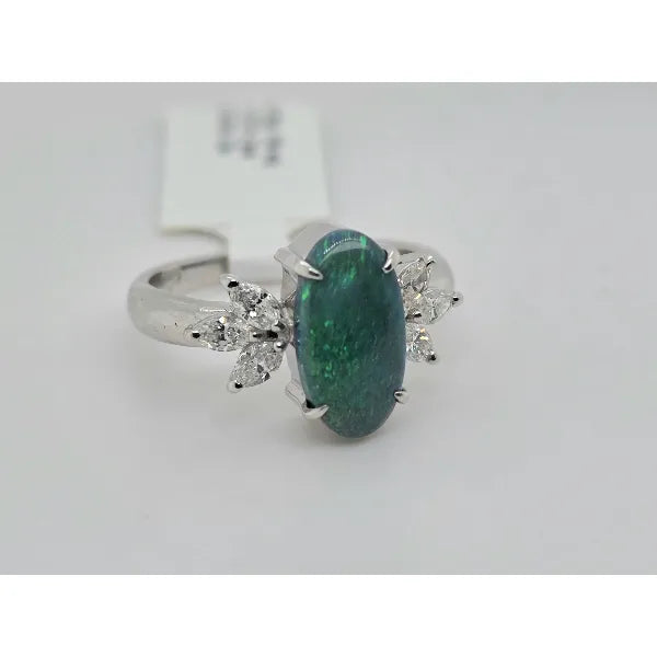 A 1.57 ct oval black opal dazzles in this 18 kt white gold ring, accented by 0.43 ctw of natural diamonds for added brilliance. Its striking color play and elegant design make it a standout piece.
