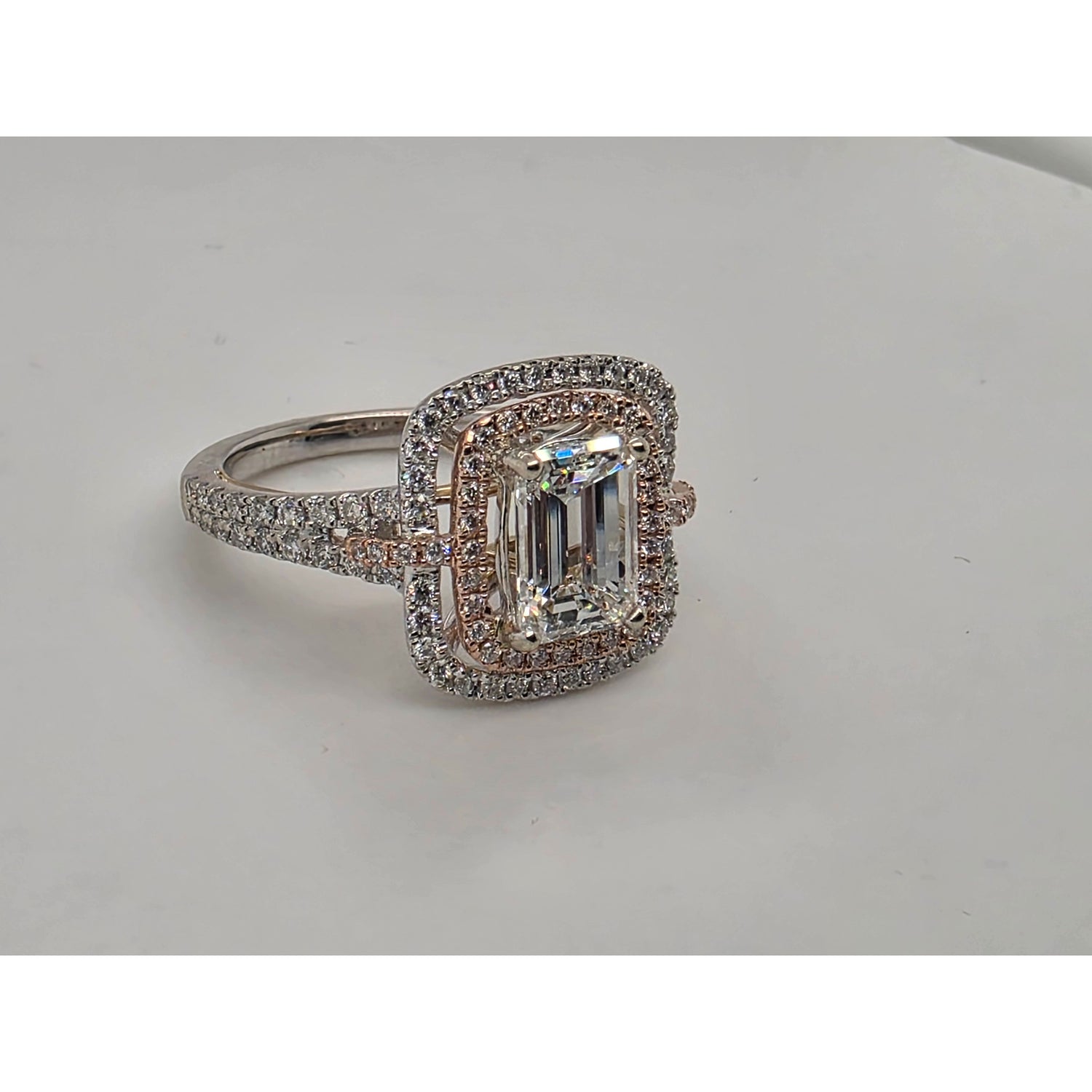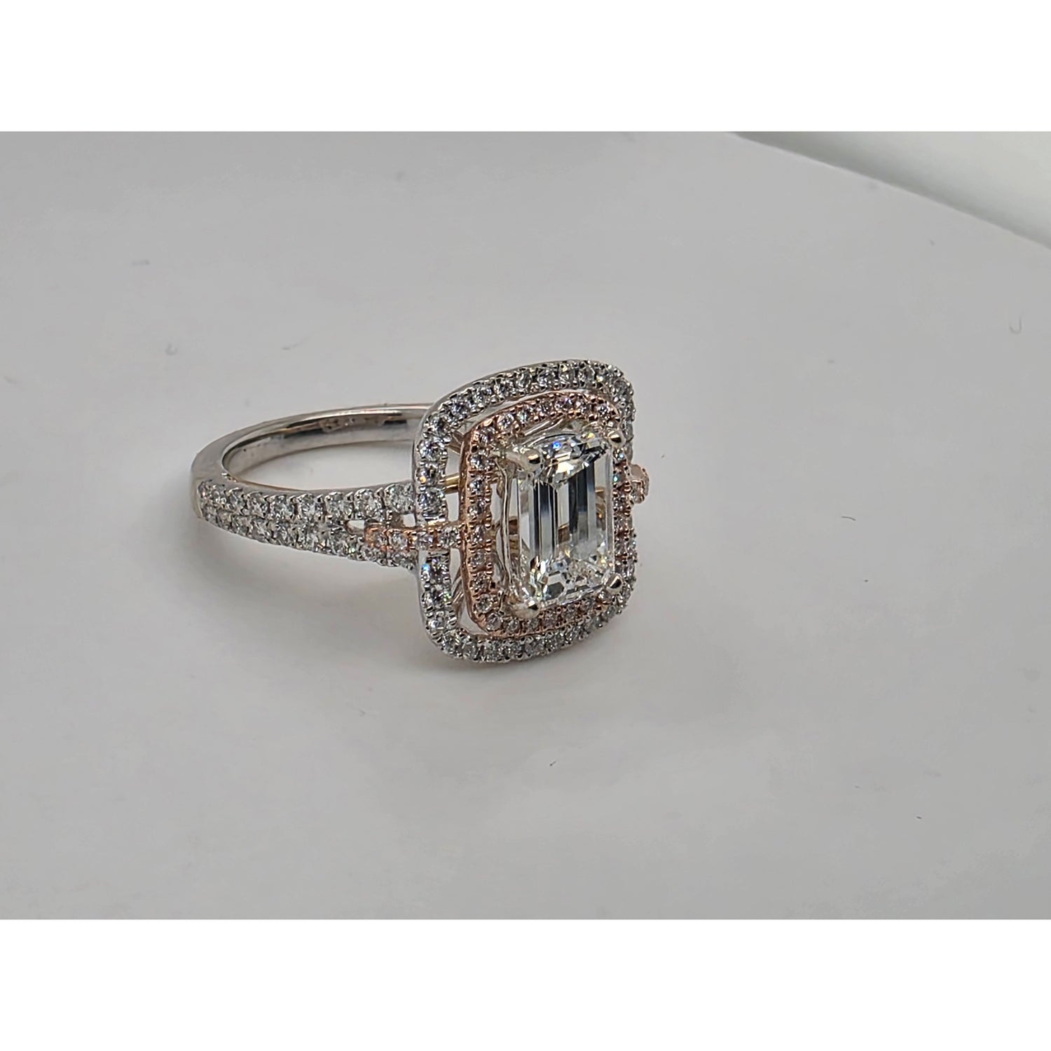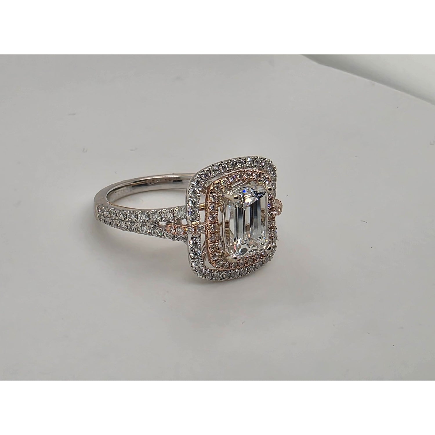 Showcase timeless elegance with this stunning 1.57ctw emerald cut natural diamond ring, graded G color and VS2 clarity. Set in luxurious 14kt two-tone gold, the center diamond is beautifully complemented by .15ctw pink diamond accents and .25ctw white diamonds that add a unique and vibrant touch. A sophisticated and eye-catching piece, perfect for someone looking for a distinctive ring with exceptional sparkle.