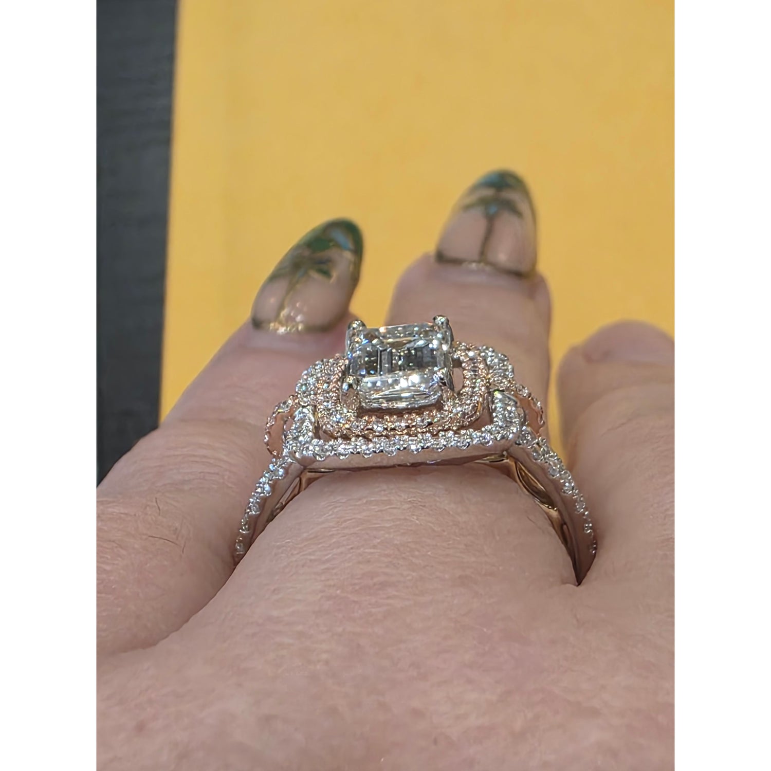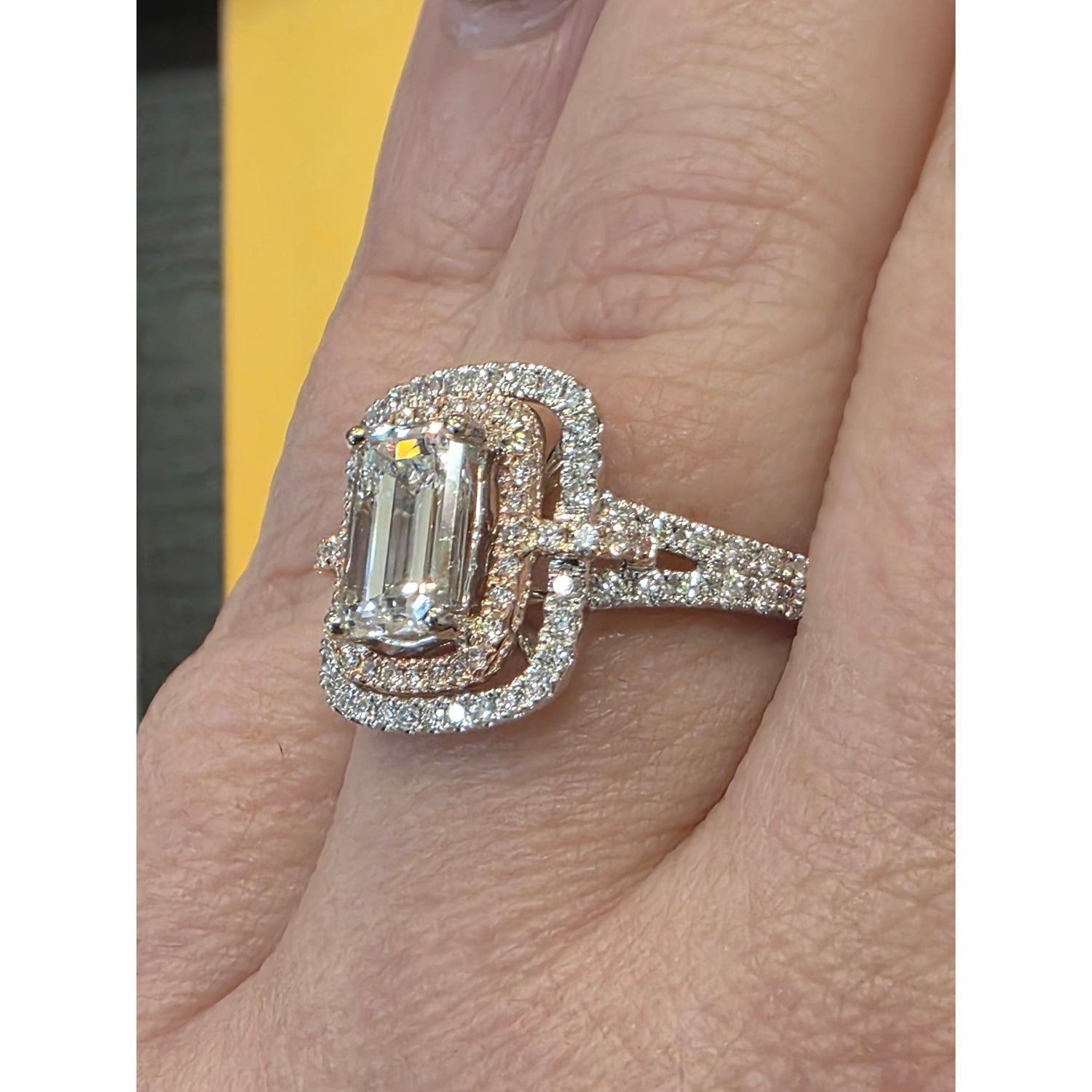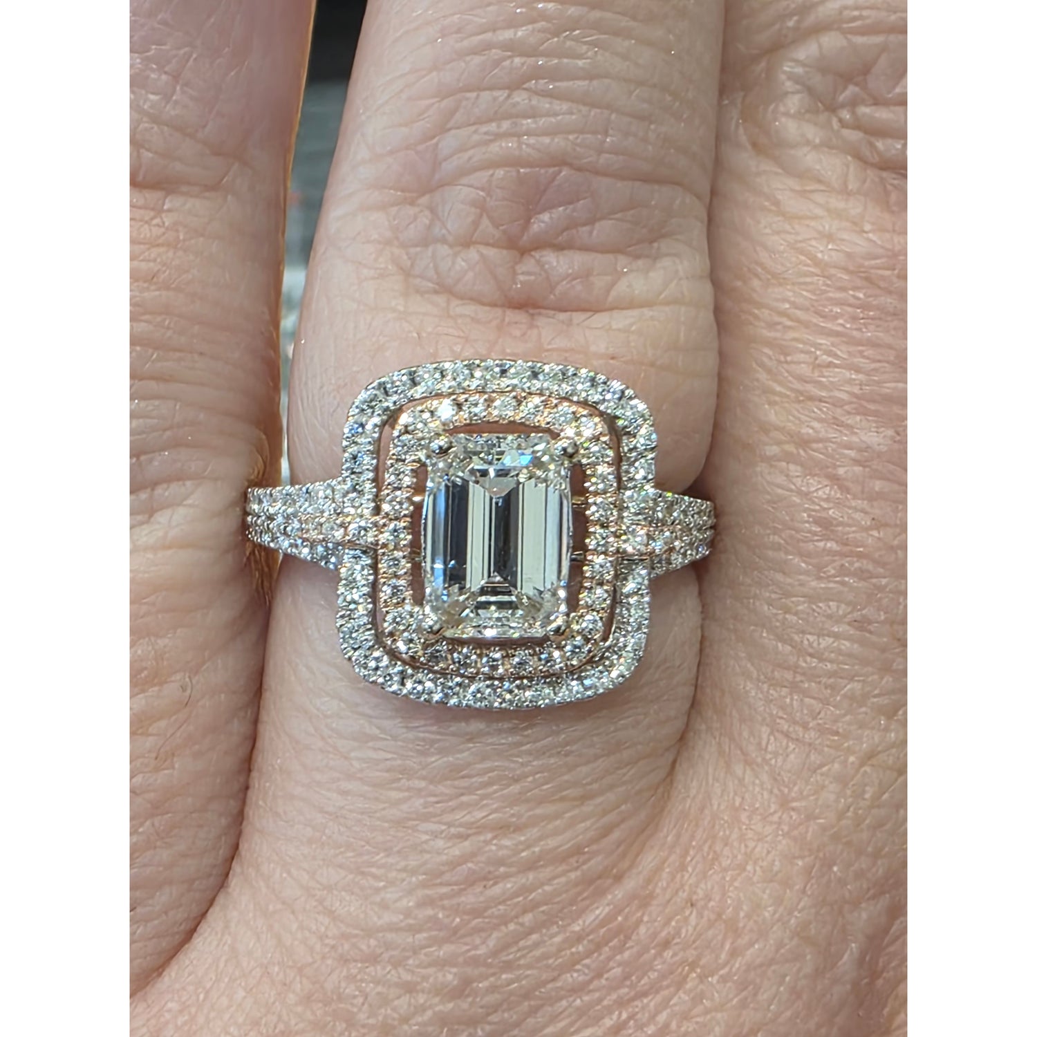 Showcase timeless elegance with this stunning 1.57ctw emerald cut natural diamond ring, graded G color and VS2 clarity. Set in luxurious 14kt two-tone gold, the center diamond is beautifully complemented by .15ctw pink diamond accents and .25ctw white diamonds that add a unique and vibrant touch. A sophisticated and eye-catching piece, perfect for someone looking for a distinctive ring with exceptional sparkle.